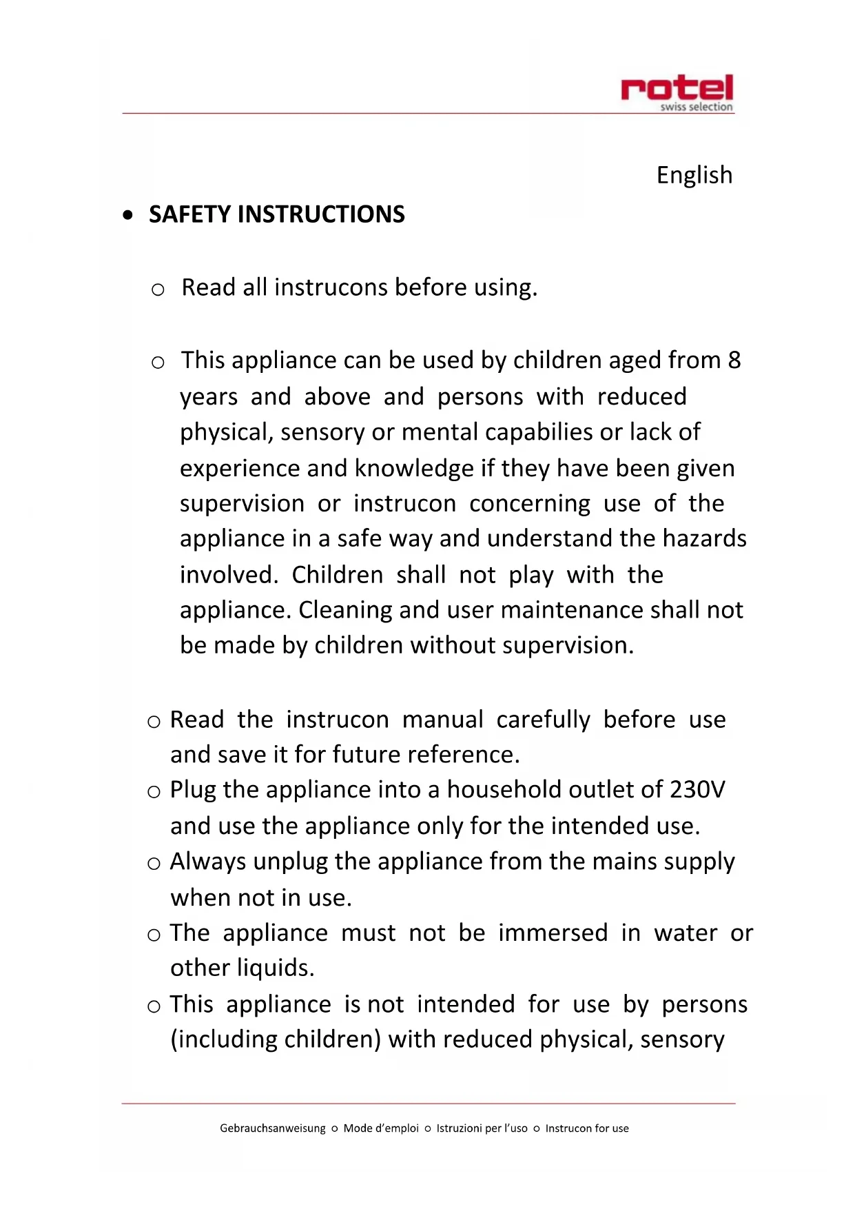 This appliance can be used by children aged from 8 years and above and persons with reduced physical, sensory or mental capabilities or lack of experience and knowledge if they have been given supervision or instrucon concerning use of the appliance in a safe way and understand the hazards involved. Children shall not play with the appliance. Cleaning and user maintenance shall not be made by children without supervision.