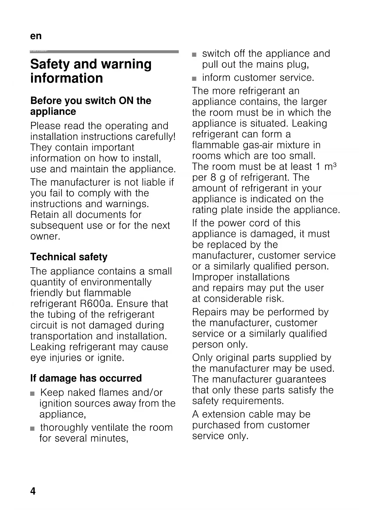 enTable of Contents enInstruction for Use Safety and warning information Before you switch ON the appliance Please read the operating and installation instructions carefully! They contain important information on how to install, use and maintain the appliance. The manufacturer is not liable if you fail to comply with the instructions and warnings. Retain all documents for subsequent use or for the next owner. Technical safety The appliance contains a small quantity of environmentally friendly but flammable refrigerant R600a. Ensure that the tubing of the refrigerant circuit is not damaged during transportation and installation. Leaking refrigerant may cause eye injuries or ignite. If damage has occurred ■ Keep naked flames and/or ignition sources away from the appliance, ■ thoroughly ventilate the room for several minutes, ■ switch off the appliance and pull out the mains plug, ■ inform customer service. The more refrigerant an appliance contains, the larger the room must be in which the appliance is situated. Leaking refrigerant can form a flammable gas-air mixture in rooms which are too small. The room must be at least 1 m³ per 8 g of refrigerant. The amount of refrigerant in your appliance is indicated on the rating plate inside the appliance. If the power cord of this appliance is damaged, it must be replaced by the manufacturer, customer service or a similarly qualified person. Improper installations and repairs may put the user at considerable risk. Repairs may be performed by the manufacturer, customer service or a similarly qualified person only. Only original parts supplied by the manufacturer may be used. The manufacturer guarantees that only these parts satisfy the safety requirements. A extension cable may be purchased from customer service only.en