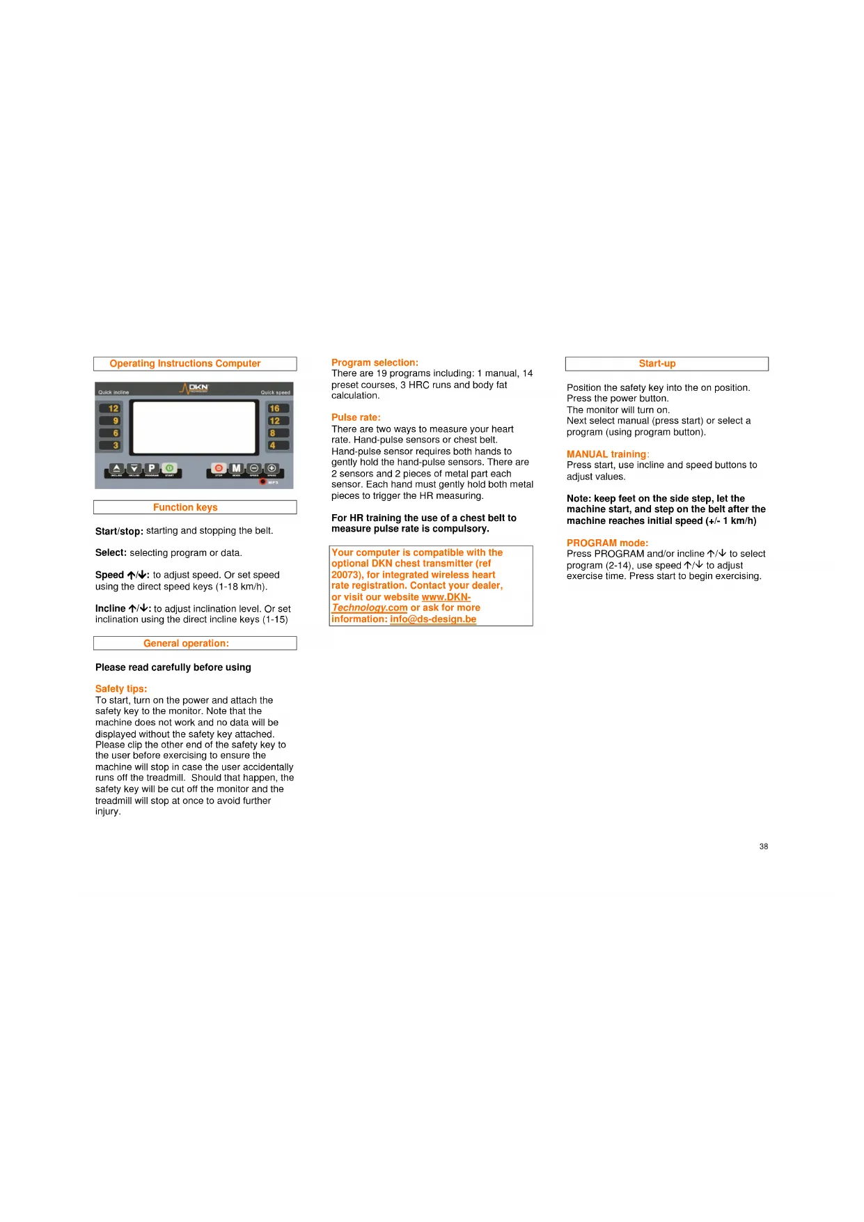 Your computer is compatible with the optional DKN chest transmitter (ref 20073), for integrated wireless heart rate registration. Contact your dealer, or visit our website www.DKN-Technology.com or ask for more information: info@ds-design.be