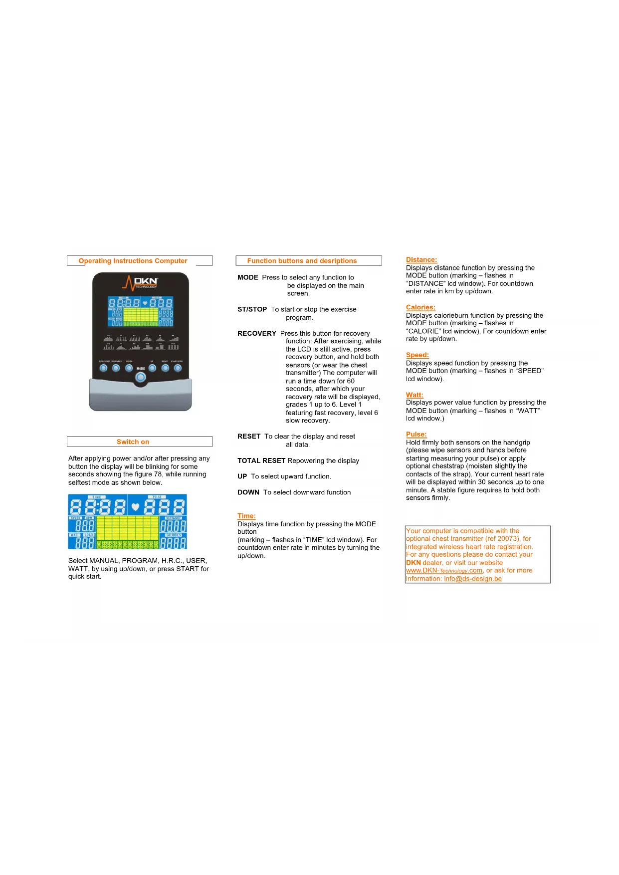 Your computer is compatible with the optional chest transmitter (ref 20073), for integrated wireless heart rate registration. For any questions please do contact your DKN dealer, or visit our website www.DKN-technology.com, or ask for more information: info@ds-design.be