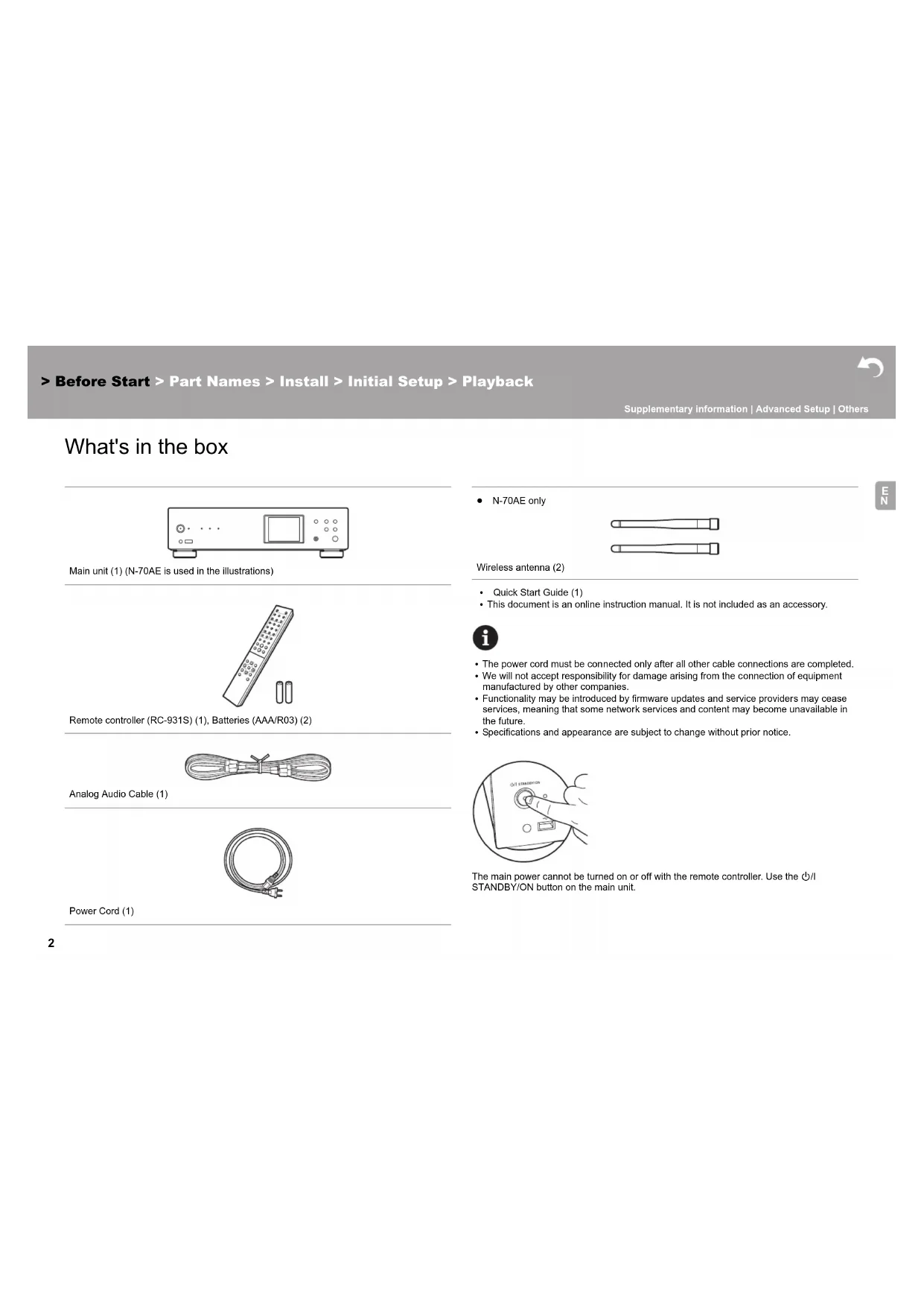 What's in the box Before Start 0 The power cord must be connected only after all other cable connections are completed. 0 We will not accept responsibility for damage arising from the connection of equipment manufactured by other companies. 0 Functionality may be introduced by firmware updates and service providers may cease services, meaning that some network services and content may become unavailable in the future. 0 Specifications and appearance are subject to change without prior notice. The main power cannot be turned on or off with the remote controller. Use the Í/I STANDBY/ON button on the main unit. Main unit (1) (N-70AE is used in the illustrations) Remote controller (RC-931S) (1), Batteries (AAA/R03) (2) Analog Audio Cable (1) Power Cord (1) ≥ N-70AE only Wireless antenna (2) 0 Quick Start Guide (1) 0 This document is an online instruction manual. It is not included as an accessory.> Before Start >Part Names > Install > Initial Setup > Playback Supplementary information | Advanced Setup | Others