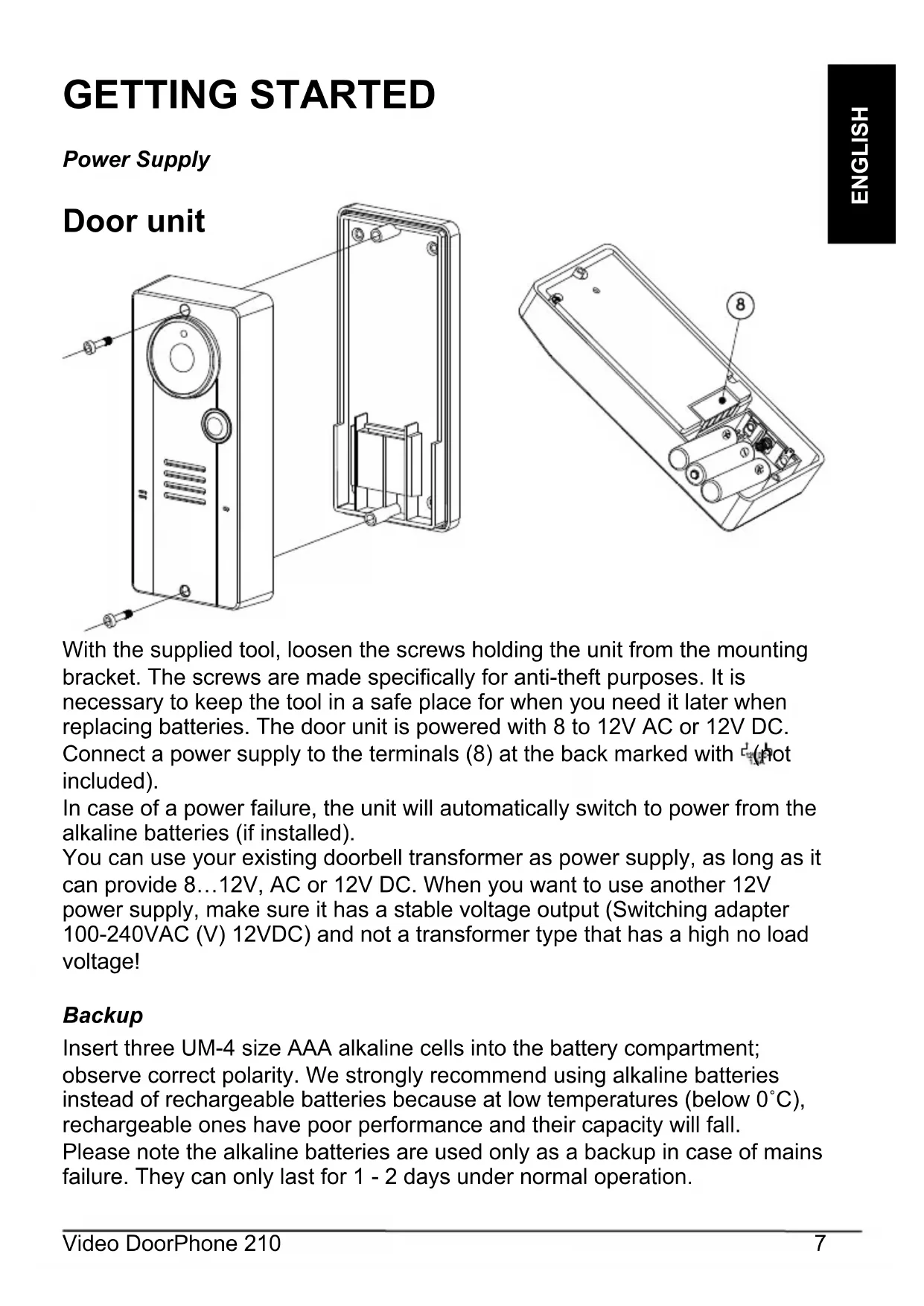 With the supplied tool, loosen the screws holding the unit from the mounting bracket. The screws are made specifically for anti-theft purposes. It is necessary to keep the tool in a safe place for when you need it later when replacing batteries. The door unit is powered with 8 to 12V AC or 12V DC. Connect a power supply to the terminals (8) at the back marked with (not included). In case of a power failure, the unit will automatically switch to power from the alkaline batteries (if installed). You can use your existing doorbell transformer as power supply, as long as it can provide 8…12V, AC or 12V DC. When you want to use another 12V power supply, make sure it has a stable voltage output (Switching adapter 100-240VAC (V) 12VDC) and not a transformer type that has a high no load voltage! Backup Insert three UM-4 size AAA alkaline cells into the battery compartment; observe correct polarity. We strongly recommend using alkaline batteries instead of rechargeable batteries because at low temperatures (below 0˚C), rechargeable ones have poor performance and their capacity will fall. Please note the alkaline batteries are used only as a backup in case of mains failure. They can only last for 1 - 2 days under normal operation.© MARMITEK