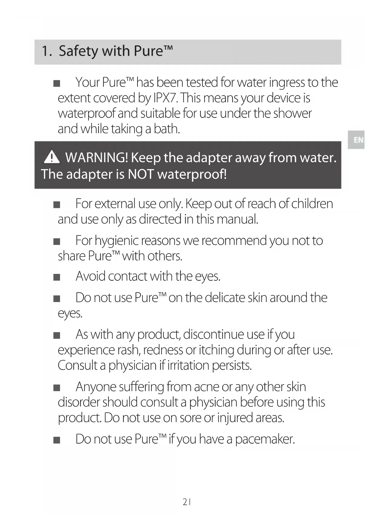 Before using Pure™ for the first time, please read the user manual in its entirety. Pay particular attention to procedures for using and operating the device and after-use procedures. Please read all warnings and safety precautions before use and strictly follow them when using.