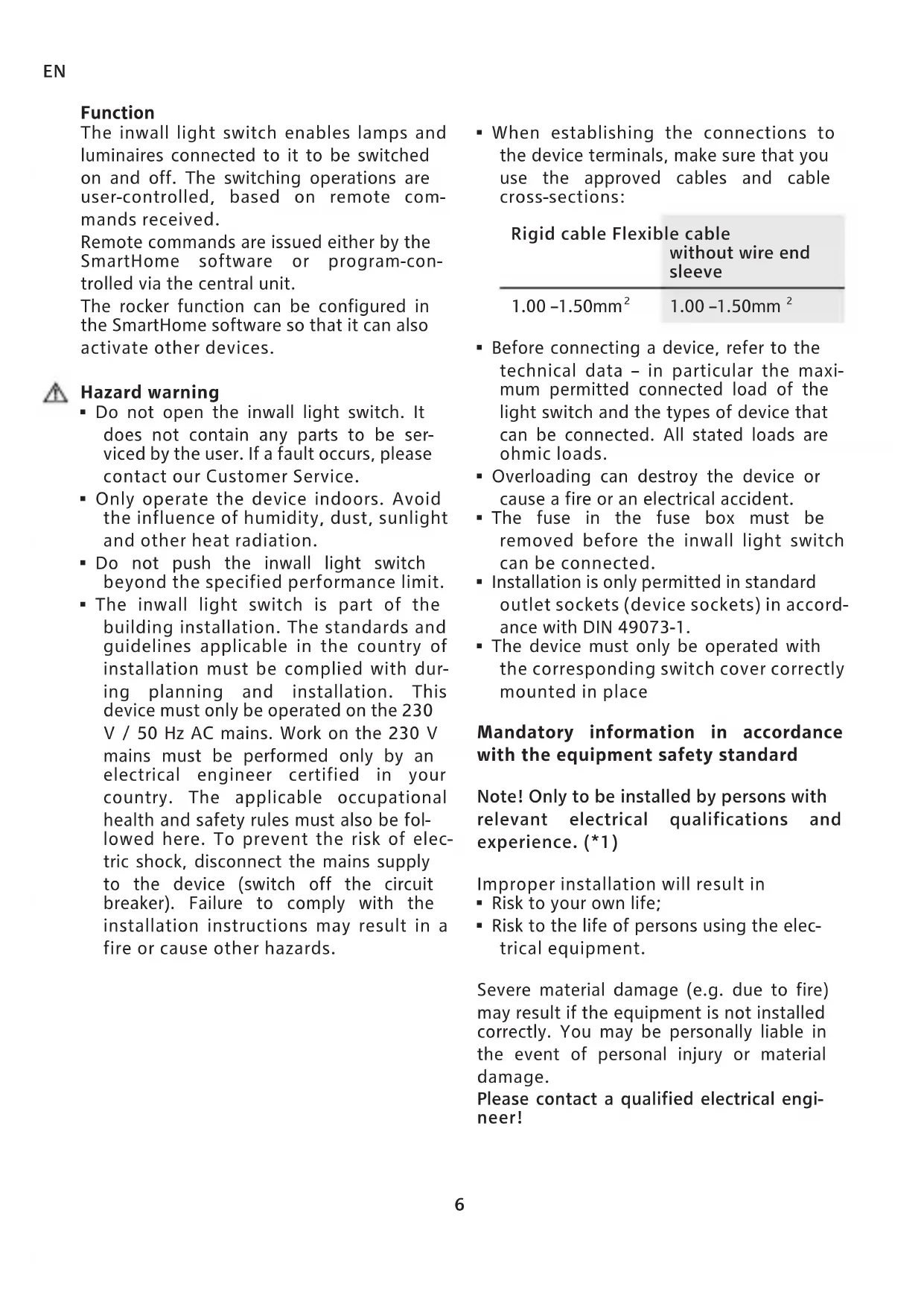 The inwall light switch is part of the building installation. The standards and guidelines applicable in the country of installation must be complied with during planning and installation. This device must only be operated on the 230 V / 50 Hz AC mains. Work on the 230 V mains must be performed only by an electrical engineer certified in your country. The applicable occupational health and safety rules must also be followed here. To prevent the risk of electric shock, disconnect the mains supply to the device (switch off the circuit breaker). Failure to comply with the installation instructions may result in a fire or cause other hazards.