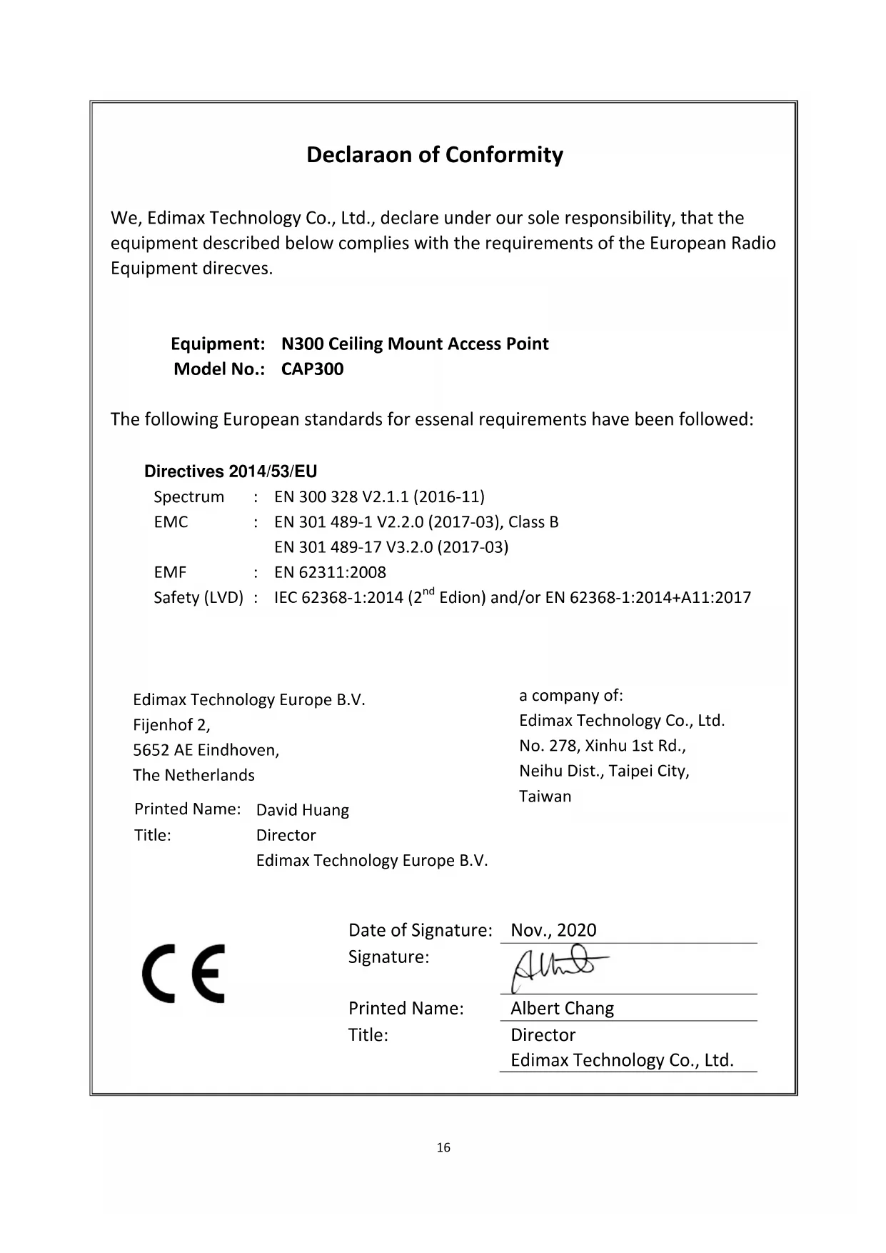We, Edimax Technology Co., Ltd., declare under our sole responsibility, that the equipment described below complies with the requirements of the European Radio Equipment directives.