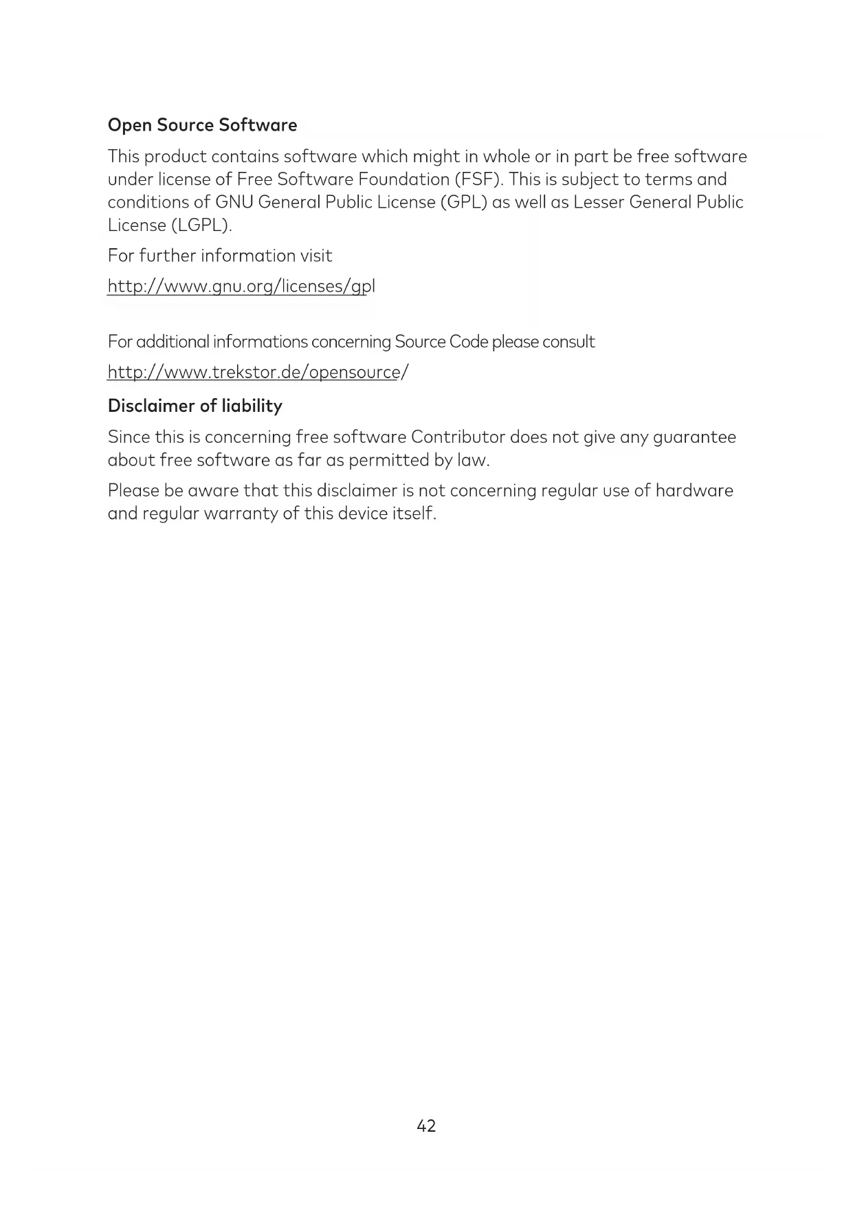 2006/1907/EC REACh: Regulation concerning the Registration, Evaluation, Authorisation and Restriction of Chemicals 2013/1272/EU PAH: REACh restricting the use of polycyclic aromatic hydrocarbons 2004/850/EC SCCP: REACh restricting the use of short chain chlorinated paraffins The following norms were consulted to assess conformity: EN 55022:2010+AC:2011: Electromagnetic compatibilty EN 55024:2010: Information technology equipment - Immunity characteristics - Limits and methods of measurement (CISPR 24:2010) EN 61000-3-2:2014: Harmonic Current Emission EN 61000-3-3:2013: Voltage Fluctuation and Flicker EN 61000-4-2:2009: Electrostatic Discharge EN 61000-4-3:2006+A1:2008+A2:2010: RF electromagnetic field immunity tests EN 61000-4-4:2012: Fast transients EN 61000-4-5:2014: Surges EN 61000-4-6:2014: Injected current EN 61000-4-8:2010: Power-frequency magnetic field EN 61000-4-11:2004: Voltage dips, short interruptions and voltage variations immunity tests EN 62209-2:2010: Human exposure to radio frequency fields from hand-held and bodymounted wireless communication devices EN 50566:2013 SAR: Product standard to demonstrate compliance of radio frequency fields from handheld and body-mounted wireless communication devices used by the general public (30 MHz - 6 GHz) EN 62479:2010 SAR: Basic restrictions related to human exposure to electromagnetic fields (10 MHz to 300 GHz) EN 300 328 V1.9.1: Electromagnetic compatibility and Radio spectrum Matters (ERM); Data transmission equipment operating in the 2,4 GHz ISM band and using wide band modulation techniques EN 301 489-1 V1.9.2 EMC and ERM: Part 1: Common technical requirements EN 301 489-17 V2.2.1 EMC and ERM: Part 17: Specific conditions for 2,4 GHz wideband transmission systems EN 50581:2012: Technical documentation for the assessment of electrical and electronic products with respect to the restriction of hazardous substances EN 50563:2011+A1:2013: External a.c. d.c. and a.c. a.c. power supplies. Determination of no-load power and average efficiency of active modes. EN 50332-1:2013: Sound system equipment: Headphones and earphones - Maximum sound pressure level measurement EN 50332-2:2013: Sound system equipment: Headphones and earphones - Maximum sound pressure level measurement EN 60950-1:2006 + A11:2009 + A1:2010 + A12:2011 + A2:2013: Information technology equipment – Safety – Part 1: General requirementsBA-PT10-V1-10-DE-170608 TREKSTOR GmbH Berliner Ring 7 64625 Bensheim, Germany www.trekstor.de Le fabricant déclare que le type d’équipement radioélectrique Primetab P10 respecte la directive 2014/53/UE. Groupes de fréquences et puissances