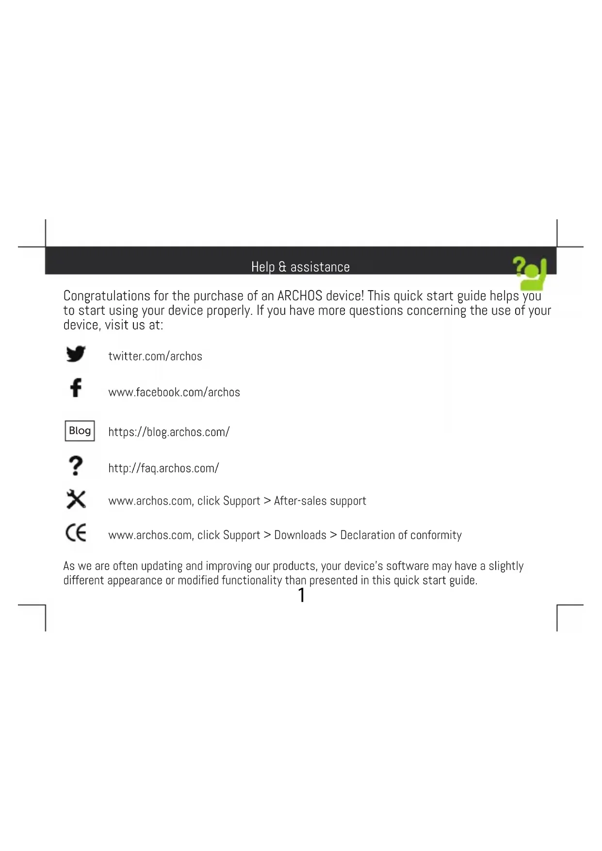 Help & assistance Congratulations for the purchase of an ARCHOS device! This quick start guide helps you to start using your device properly. If you have more questions concerning the use of your device, visit us at: twitter.com/archos www.facebook.com/archos Blog https://blog.archos.com/ http://faq.archos.com/ www.archos.com, click Support > After-sales support www.archos.com, click Support > Downloads > Declaration of conformity As we are often updating and improving our products, your device’s software may have a slightly different appearance or modified functionality than presented in this quick start guide.2 Warranty Unboxing ARCHOS 50F Neon Quick start guide Warranty, legal and safety notice Charging cable Charger adapter3 Describing your device Front camera Phone speaker Headphone jack Back camera Flash light ON/OFF Volume Loudspeaker Micro-USB port Light sensor Microphone4 Picture to show how to remove the bottom casing Remove the battery Picture to show the scards position