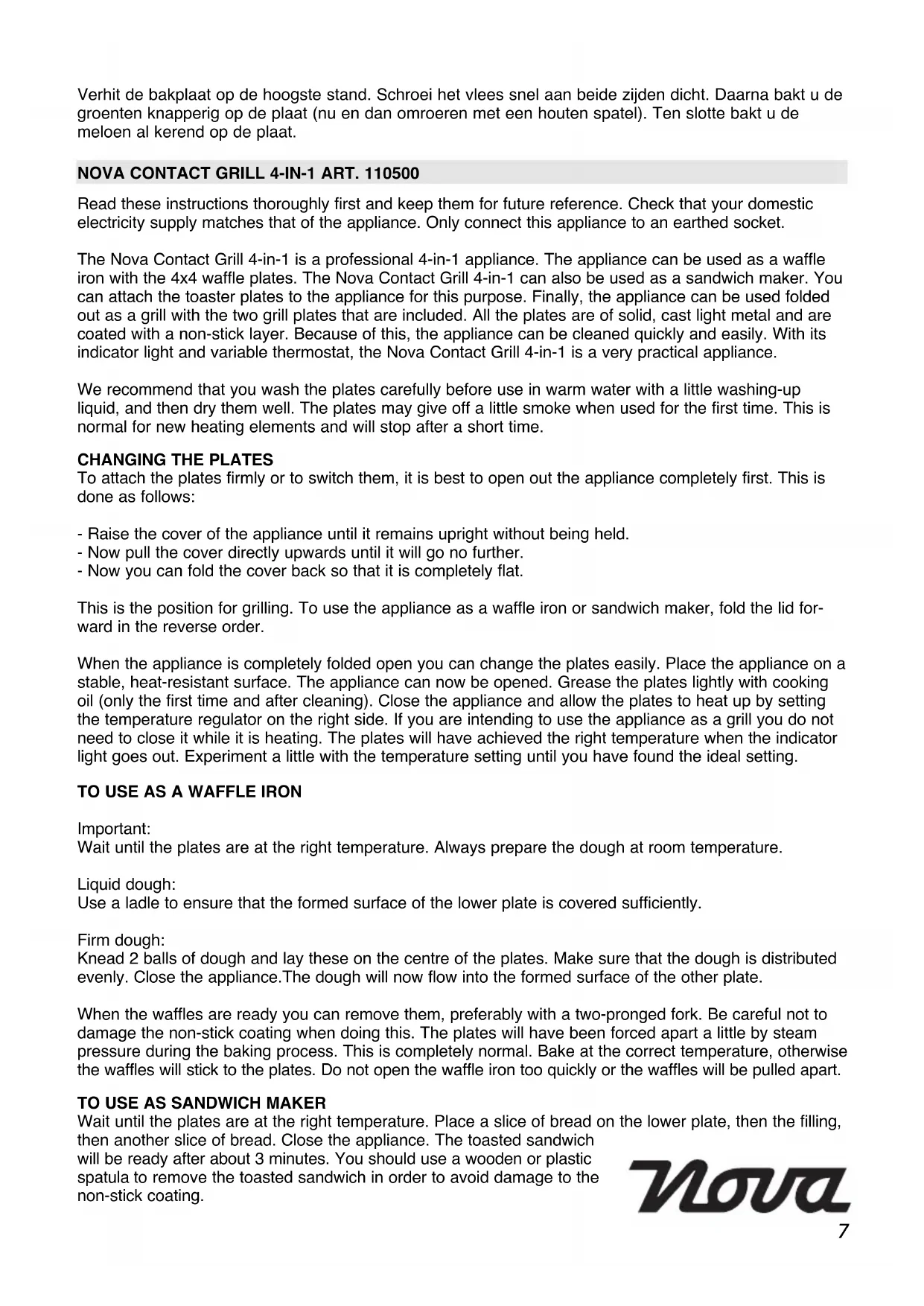 In order to grill, heat the appliance while closed as it will heat much faster like this. When the plates are heated, open the appliance. This open grilling position is handy for use in the kitchen and is also very nice at the table! Moreover, it is a healthy way to grill or fry because no oil or butter is required. The cooking time and temperature setting will depend on the chosen dish or ingredients. You can, of course, experiment with the cooking time and the temperature setting to get the best results. Small pieces of meat, fish etc. will be cooked through faster than large pieces. Turn meat and fish once only in order to prevent them from drying out. For the same reason it is better to use a spatula than to prick with a fork. Use a wooden or plastic spatula on the frying plate. Do not use metal implements as these could damage the non-stick coating. You can also grill while the appliance is closed. To do this, place the meat, fish or other ingredients on the lowest frying plate before closing the appliance. CLEANING ALWAYS UNPLUG THE APPLIANCE BEFORE CLEANING. Clean the appliance after each time that you use it. Allow the appliance to cool completely first. Clean the outside with a damp cloth. The plates should be cleaned in warm water with washing-up liquid and then rinsed with clean water from the tap. Do not use any sharp metal objects or aggressive substances on the non-stick coating. If the plates are very dirty they should be soaked for half an hour in hot water and detergent. After grilling it is frequently only necessary to wipe the plates with kitchen paper while the appliance is still warm. DAMAGE TO THE PLATES FROM SHARP OBJECTS IS NOT COVERED UNDER THE GUARANTEE! NOVA ADVICE - Place the appliance on a stable and heat-resistant surface. - When you use the appliance in the open position the table or kitchen surface will become very hot. For that reason, never put the open appliance on an unprotected plastic surface. - Never immerse the appliance in water or any other liquid. - The outside of the appliance will become hot, so you should only hold it by the handle. - Ensure that the appliance is not so close to the edge of the table or work surface that someone could knock it off. Also, ensure that the cable is not trailing where someone could trip over it. - Do not use the appliance if it is damaged or if the cable is damaged. Instead, send it to our service department. With this type of appliance a damaged cable should only be replaced by our service department using special tools. - Do not place the appliance on or directly adjacent to a warm hotplate or other source of heat. - Always unplug the appliance before cleaning or if any fault develops. - The plates get very hot. Ensure that children cannot reach them, and be careful with them yourself. - Do not use any abrasive cleaning materials. - Only use the apparatus according to the instructions. - Do not use any accessories that are not recommended by the manufacturer, - The cable should never be allowed to come into contact with the plates. - This appliance is not intended for use by persons(including children) with reduced physical, sensory or mental capabilities or lack of experience and knowledge unless they have been given initial supervision or instruction concerning use of the appliance by a person responsible for their safety. - Children shall be supervised to ensure that they do not play with the appliance. - If the supply cord is damaged, it must be replaced by the manufacturer, its service agent or similarly qualified persons in order to avoid a hazard. 8SOME RECIPES WAFFLE RECIPE (FOR ABOUT 8 WAFFLES) Ingredients: 500 grams butter 500 grams self-raising flour 500 grams sugar 8 eggs Preparation: Melt the butter slowly, then add the sugar and 8 egg yolks. Mix them all to a creamy consistency. Whip the egg whites until stiff. Now add the sieved flour, slowly at first, and mix it to form a thick mass. Finally, add the whipped egg whites. The dough is now ready for use.