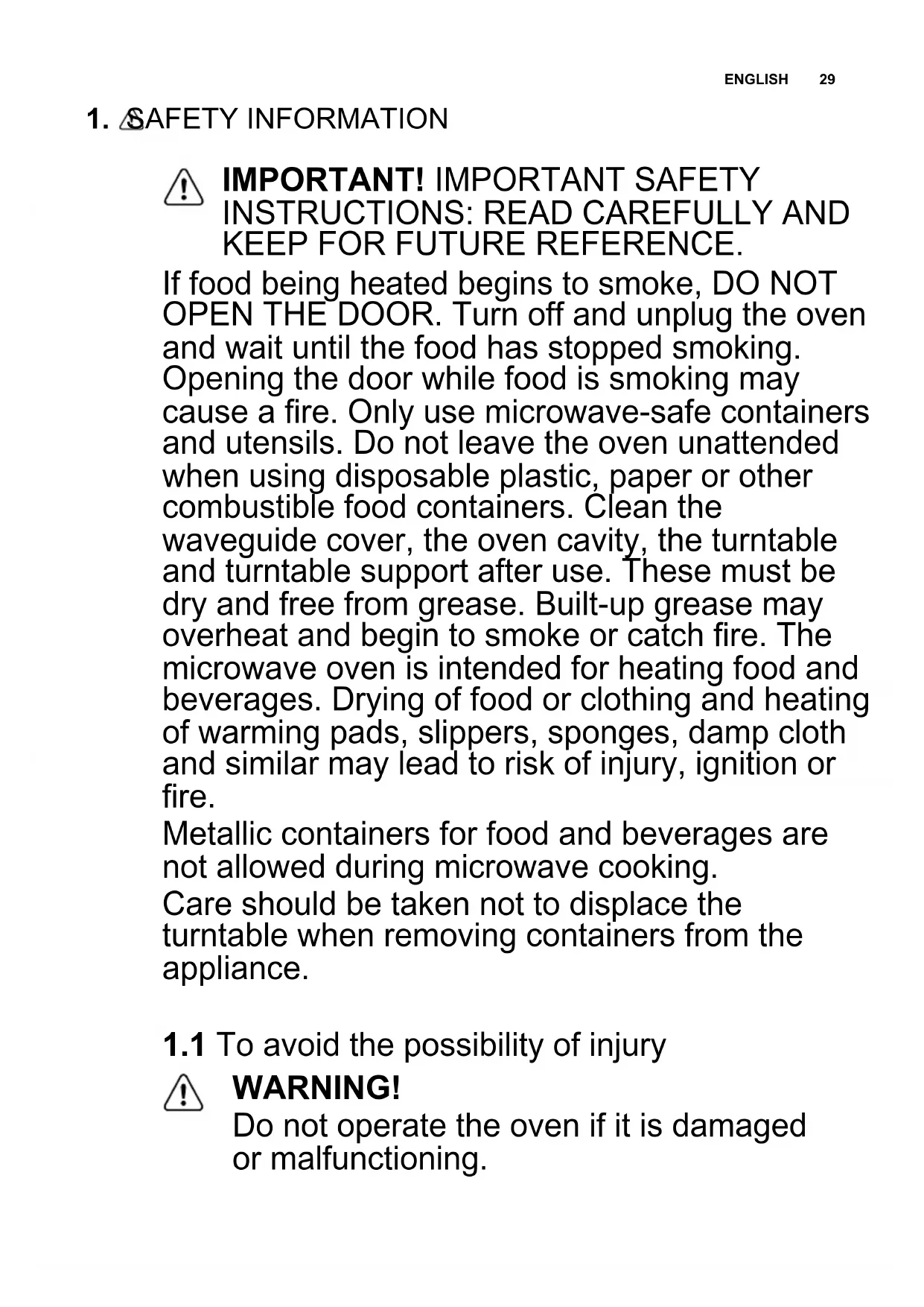 KEEP FOR FUTURE REFERENCE. If food being heated begins to smoke, DO NOT OPEN THE DOOR. Turn off and unplug the oven and wait until the food has stopped smoking. Opening the door while food is smoking may cause a fire. Only use microwave-safe containers and utensils. Do not leave the oven unattended when using disposable plastic, paper or other combustible food containers. Clean the waveguide cover, the oven cavity, the turntable and turntable support after use. These must be dry and free from grease. Built-up grease may overheat and begin to smoke or catch fire. The microwave oven is intended for heating food and beverages. Drying of food or clothing and heating of warming pads, slippers, sponges, damp cloth and similar may lead to risk of injury, ignition or fire. Metallic containers for food and beverages are not allowed during microwave cooking. Care should be taken not to displace the turntable when removing containers from the appliance.