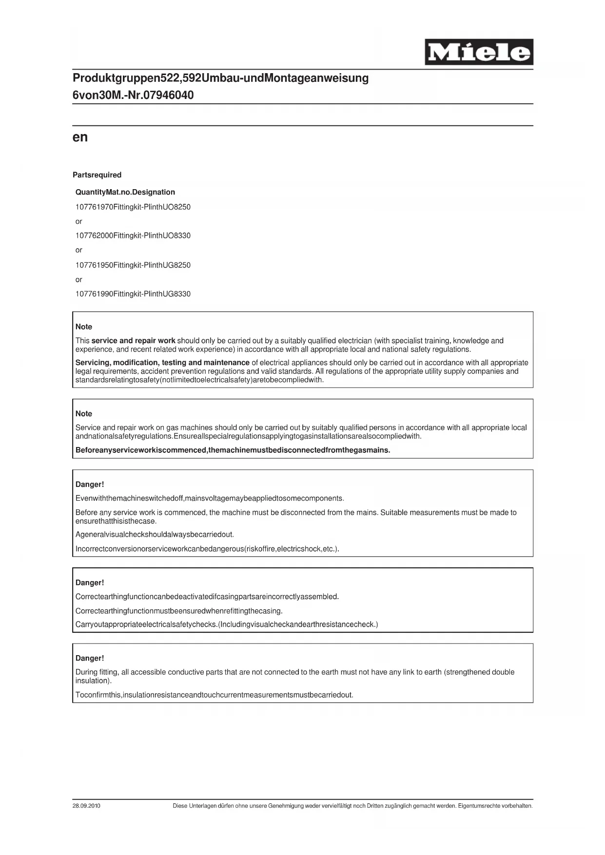 1 07761990 Fitting kit - Plinth UG 8330 Note This service and repair work should only be carried out by a suitably qualified electrician (with specialist training, knowledge and experience, and recent related work experience) in accordance with all appropriate local and national safety regulations. Servicing, modification, testing and maintenance of electrical appliances should only be carried out in accordance with all appropriate legal requirements, accident prevention regulations and valid standards. All regulations of the appropriate utility supply companies and standards relating to safety (not limited to electrical safety) are to be complied with. Note Service and repair work on gas machines should only be carried out by suitably qualified persons in accordance with all appropriate local and national safety regulations. Ensure all special regulations applying to gas installations are also complied with. Before any service work is commenced, the machine must be disconnected from the gas mains. Danger! Even with the machine switched of f, mains voltage may be applied to some components. Before any service work is commenced, the machine must be disconnected from the mains. Suitable measurements must be made to ensure that this is the case. A general visual check should always be carried out. Incorrect conversion or service work can be dangerous (risk of fire, electric shock, etc.). Danger! Correct earthing function can be deactivated if casing parts are incorrectly assembled. Correct earthing function must be ensured when refitting the casing. Carry out appropriate electrical safety checks. (Including visual check and earth resistance check.) Danger! During fitting, all accessible conductive parts that are not connected to the earth must not have any link to earth (strengthened double insulation). To confirm this, insulation resistance and touch current measurements must be carried out. Produktgruppen 522, 592 Umbau- und Montageanweisung 6 von 30 M.-Nr. 07946040 28.09.2010 Diese Unterlagen dürfen ohne unsere Genehmigung weder vervielfältigt noch Dritten zugänglich gemacht werden. Eigentumsrechte vorbehalten.Danger! Risk of injury during fitting.
