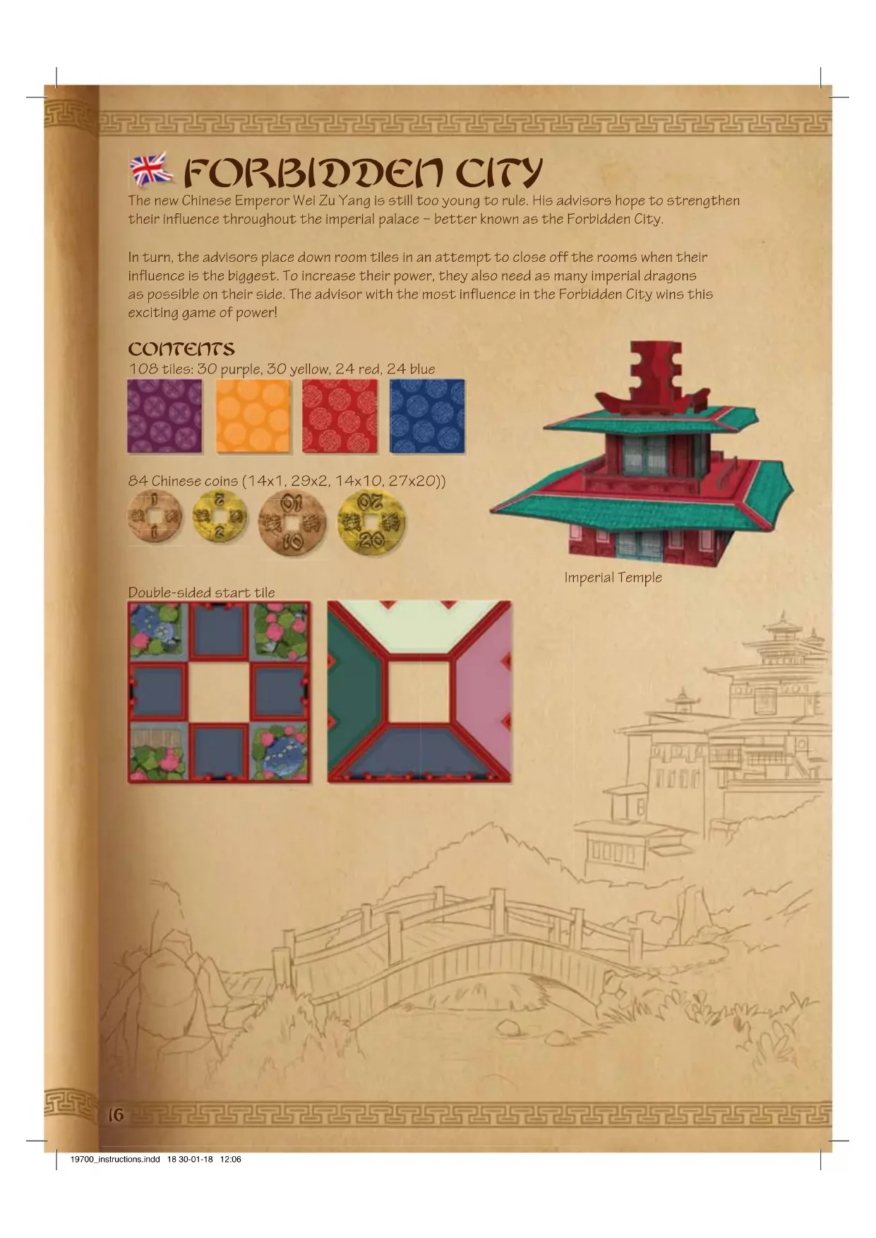 19700_instructions.indd 17 30-01-18 12:0416 FORBIDDEN CITY The new Chinese Emperor Wei Zu Yang is still too young to rule. His advisors hope to strengthen their influence throughout the imperial palace – better known as the Forbidden City. In turn, the advisors place down room tiles in an attempt to close off the rooms when their influence is the biggest. To increase their power, they also need as many imperial dragons as possible on their side. The advisor with the most influence in the Forbidden City wins this exciting game of power! CONTENTS 108 tiles: 30 purple, 30 yellow, 24 red, 24 blue 84 Chinese coins (14x1, 29x2, 14x10, 27x20)) Double-sided start tile Imperial Temple 19700_instructions.indd 18 30-01-18 12:06AIM OF THE GAME You are an advisor in the Imperial Temple of Wei Zu Yang and you want more power. That is why you try to earn as many Chinese coins as possible. You do so by occupying rooms in the Forbidden City. But watch out, the other advisors plan to do exactly the same! PREPARATIONS