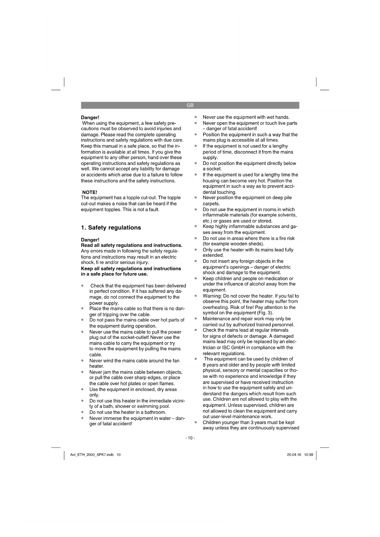 The equipment can be used indoors in a free standing position. Keep a minimum distance of 0,5 m between the housing and walls, com- bustible materials (furniture, curtains, etc.). The equipment may only be used completely mounted and standing vertically on a stable surface. It is prohibited to operate the equipment on an instab- le surface (e.g. on a bed). Important. Before using the equipment for the fi rst time, check that the voltage supply is the same as the voltage details set out on the rating plate. Read the safety regulations in section 1. When the equipment is used for the fi rst time or after a long period of rest it may emit an odor for a short time. This is not a fault. Anl_ETH_2000_SPK7.indb 11Anl_ETH_2000_SPK7.indb 11 20.04.16 10:3920.04.16 10:39GB