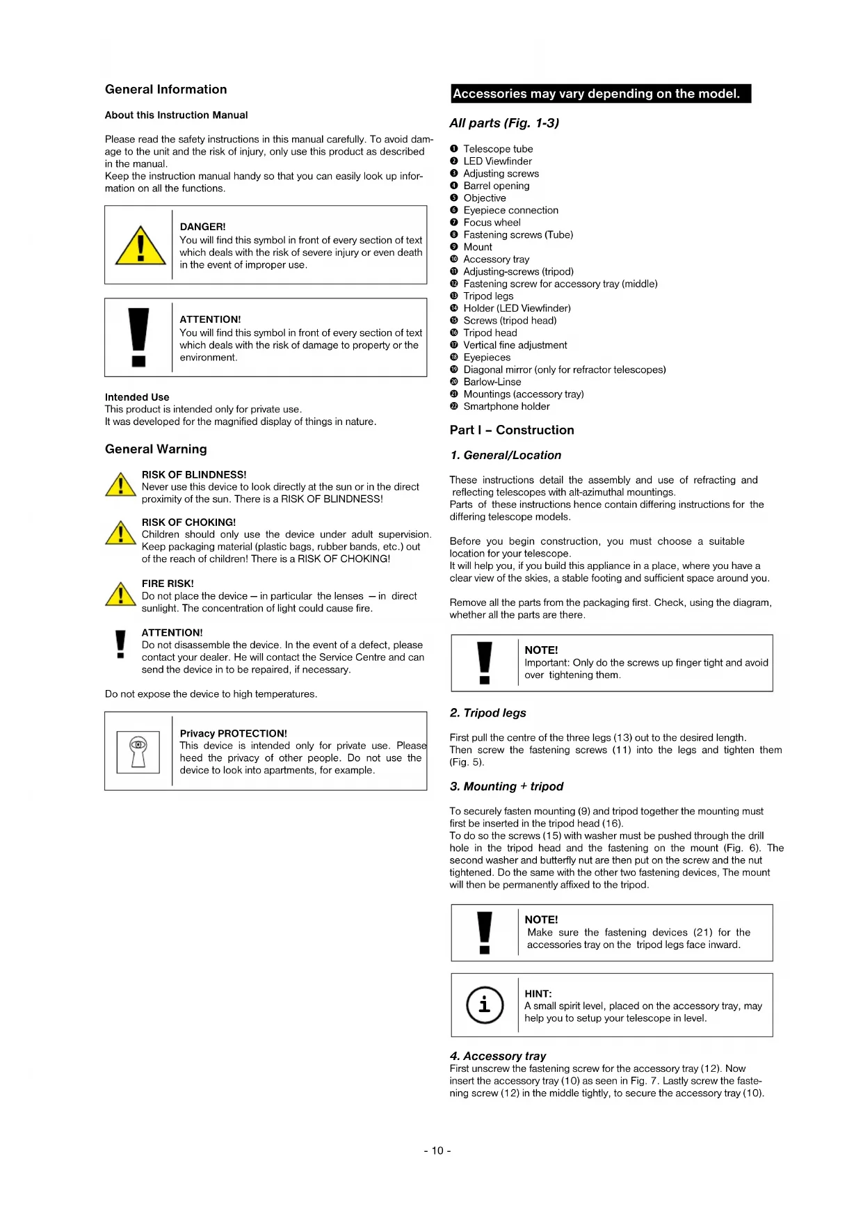 - Bedienungsanleitung GARANTIE & SERVICE Die reguläre Garantiezeit beträgt 2 Jahre und beginnt am Tag des Kaufs. Um von einer verlängerten, freiwilligen Garantiezeit wie auf dem Geschenkkarton angegeben zu profitieren, ist eine Registrierung auf unserer Website erforderlich. Die vollständigen Garantiebedingungen sowie Informationen zu Garantiezeitverlängerung und Serviceleistungen können Sie unter www.bresser.de/garantiebedingungen einsehen.- 10 - General Information About this Instruction Manual Please read the safety instructions in this manual carefully. To avoid dam- age to the unit and the risk of injury, only use this product as described in the manual. Keep the instruction manual handy so that you can easily look up infor- mation on all the functions. DANGER! You will find this symbol in front of every section of text which deals with the risk of severe injury or even death in the event of improper use. ATTENTION! You will find this symbol in front of every section of text which deals with the risk of damage to property or the environment. Intended Use This product is intended only for private use. It was developed for the magnified display of things in nature. General Warning RISK OF BLINDNESS! Never use this device to look directly at the sun or in the direct proximity of the sun. There is a RISK OF BLINDNESS! RISK OF CHOKING! Children should only use the device under adult supervision. Keep packaging material (plastic bags, rubber bands, etc.) out of the reach of children! There is a RISK OF CHOKING! FIRE RISK! Do not place the device — in particular the lenses — in direct sunlight. The concentration of light could cause fire. ATTENTION! Do not disassemble the device. In the event of a defect, please contact your dealer. He will contact the Service Centre and can send the device in to be repaired, if necessary. Do not expose the device to high temperatures. Privacy PROTECTION! This device is intended only for private use. Please heed the privacy of other people. Do not use the device to look into apartments, for example. Accessories may vary depending on the model. All parts (Fig. 1-3) B Telescope tube C LED Viewfinder D Adjusting screws E Barrel opening F Objective G Eyepiece connection H Focus wheel I Fastening screws (Tube) J Mount