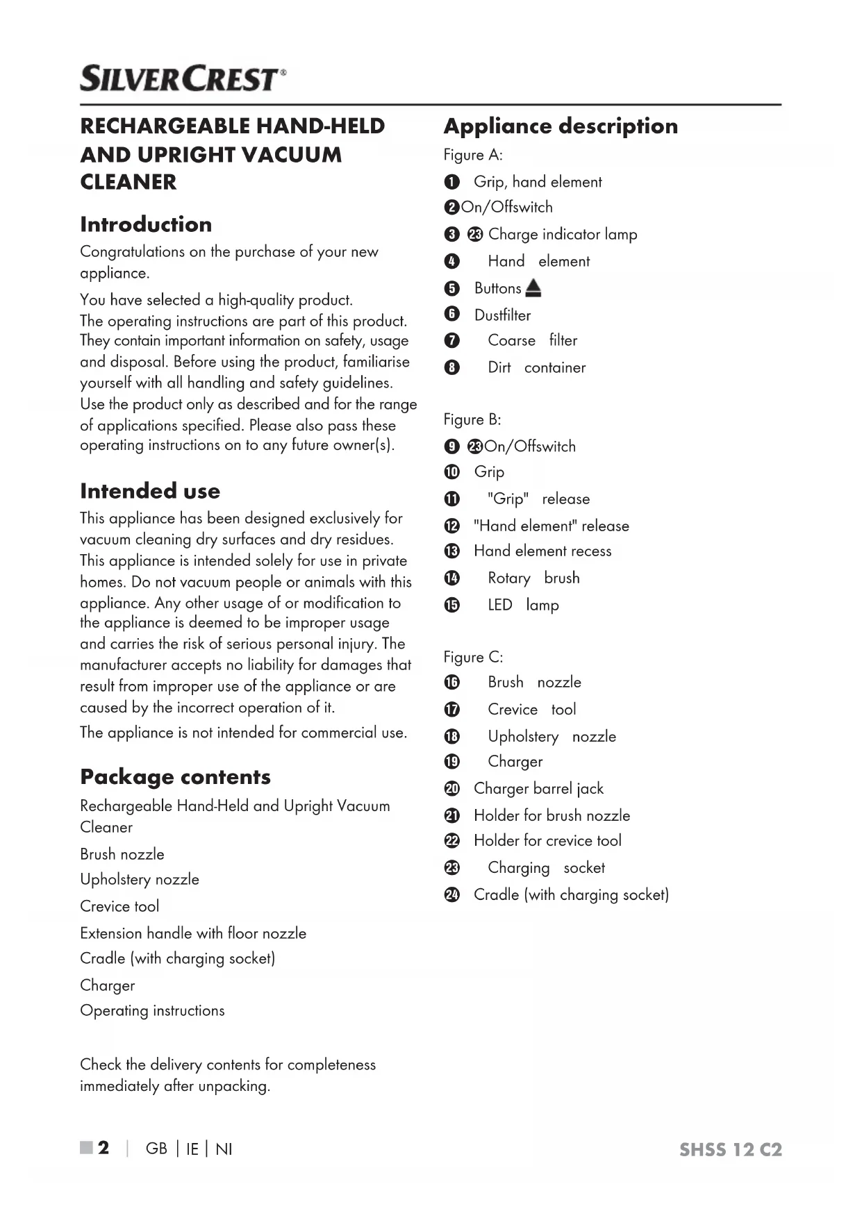 CLEANER Introduction Congratulations on the purchase of your new appliance. You have selected a high-quality product. The operating instructions are part of this product. They contain important information on safety, usage and disposal. Before using the product, familiarise yourself with all handling and safety guidelines. Use the product only as described and for the range of applications specified. Please also pass these operating instructions on to any future owner(s). Intended use This appliance has been designed exclusively for vacuum cleaning dry surfaces and dry residues. This appliance is intended solely for use in private homes. Do not vacuum people or animals with this appliance. Any other usage of or modification to the appliance is deemed to be improper usage and carries the risk of serious personal injury. The manufacturer accepts no liability for damages that result from improper use of the appliance or are caused by the incorrect operation of it. The appliance is not intended for commercial use. Package contents Rechargeable Hand-Held and Upright Vacuum Cleaner Brush nozzle Upholstery nozzle Crevice tool Extension handle with floor nozzle Cradle (with charging socket) Charger Operating instructions Check the delivery contents for completeness immediately after unpacking. Appliance description Figure A: Grip, hand element On/Off switch Charge indicator lamp Hand element
