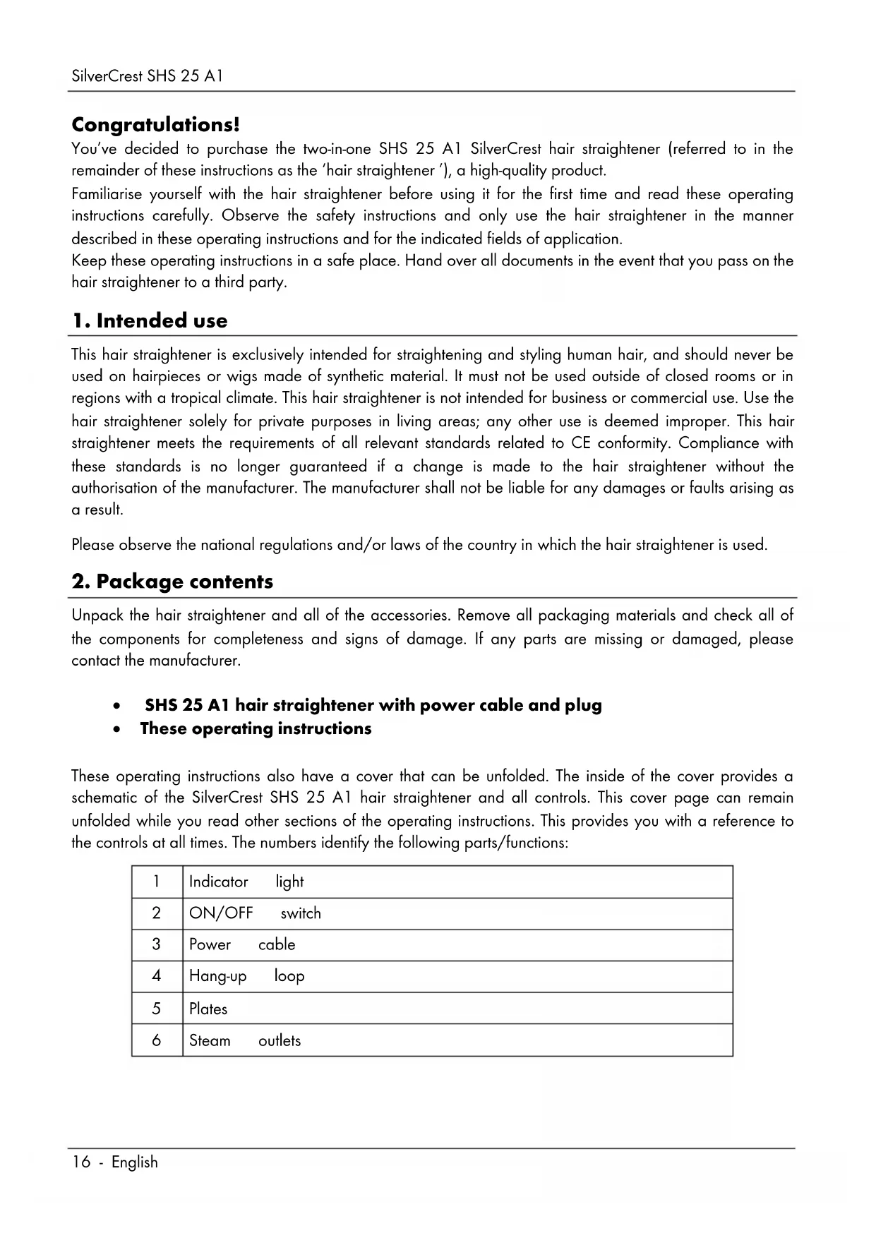 Download the instructions for your Hair straightener in PDF format for free! Find your manual SHS 25 A1 - SILVERCREST and take your electronic device back in hand. On this page are published all the documents necessary for the use of your device. SHS 25 A1 by SILVERCREST.