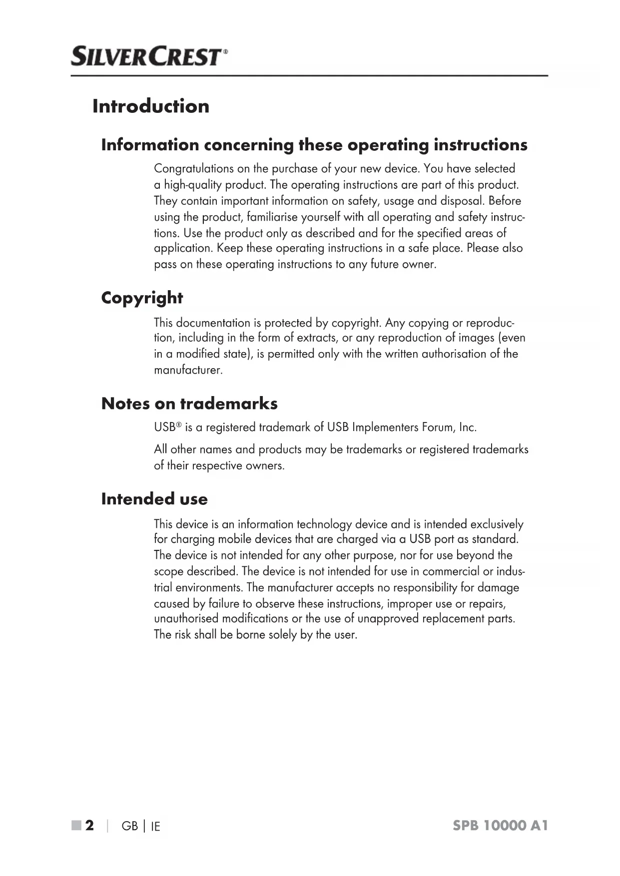 SPB 10000 A1 Introduction Information concerning these operating instructions Congratulations on the purchase of your new device. You have selected a high-quality product. The operating instructions are part of this product. They contain important information on safety, usage and disposal. Before using the product, familiarise yourself with all operating and safety instruc- tions. Use the product only as described and for the specified areas of application. Keep these operating instructions in a safe place. Please also pass on these operating instructions to any future owner. Copyright This documentation is protected by copyright. Any copying or reproduc- tion, including in the form of extracts, or any reproduction of images (even in a modified state), is permitted only with the written authorisation of the manufacturer. Notes on trademarks USB