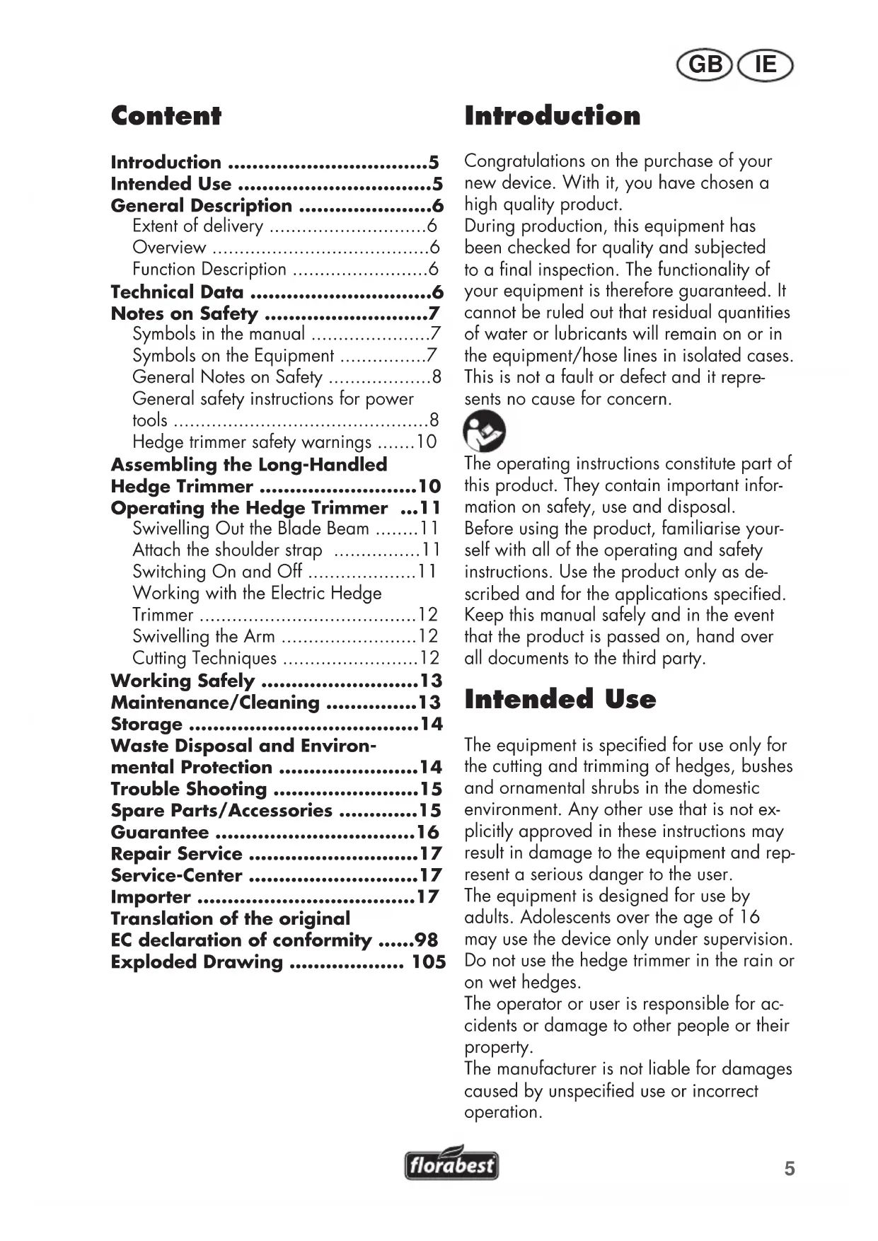 - Exploded Drawing Introduction Congratulations on the purchase of your new device. With it, you have chosen a high quality product. During production, this equipment has been checked for quality and subjected to a nal inspection. The functionality of your equipment is therefore guaranteed. It cannot be ruled out that residual quantities of water or lubricants will remain on or in the equipment/hose lines in isolated cases. This is not a fault or defect and it repre- sents no cause for concern. The operating instructions constitute part of this product. They contain important infor- mation on safety, use and disposal. Before using the product, familiarise your- self with all of the operating and safety instructions. Use the product only as de- scribed and for the applications specied. Keep this manual safely and in the event that the product is passed on, hand over all documents to the third party. Intended Use The equipment is specied for use only for the cutting and trimming of hedges, bushes and ornamental shrubs in the domestic environment. Any other use that is not ex- plicitly approved in these instructions may result in damage to the equipment and rep- resent a serious danger to the user. The equipment is designed for use by adults. Adolescents over the age of 16 may use the device only under supervision. Do not use the hedge trimmer in the rain or on wet hedges. The operator or user is responsible for ac- cidents or damage to other people or their property. The manufacturer is not liable for damages caused by unspecied use or incorrect operation.6 GB IE Before use, check that the blades are sharp. Ensure that the blades are sharpened whenever blunt, in order to avoid overstressing of the ma-chine. Damages caused by cutting with blunt blades are not covered by the guarantee. General Description Extent of delivery - Long-handled hedge trimmer (two-part)- Blade protection- Leg protection- Shoulder strap- Round handle- Allen wrench- Instruction Manual See the front fold-out page for illustrations. Overview p. 105