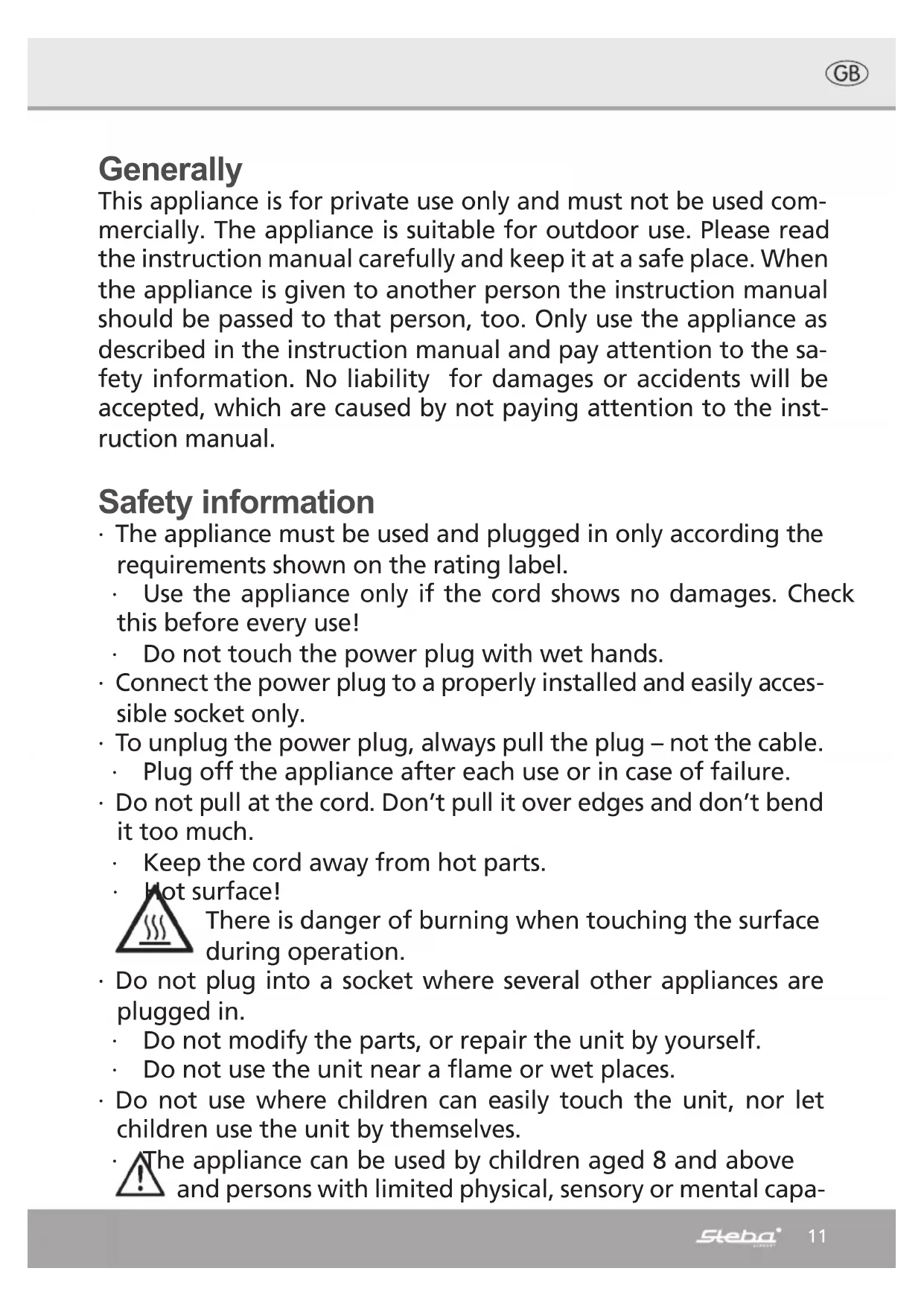 This appliance is for private use only and must not be used commercially. The appliance is suitable for outdoor use. Please read the instruction manual carefully and keep it at a safe place. When the appliance is given to another person the instruction manual should be passed to that person, too. Only use the appliance as described in the instruction manual and pay attention to the safety information. No liability for damages or accidents will be accepted, which are caused by not paying attention to the instruction manual.
