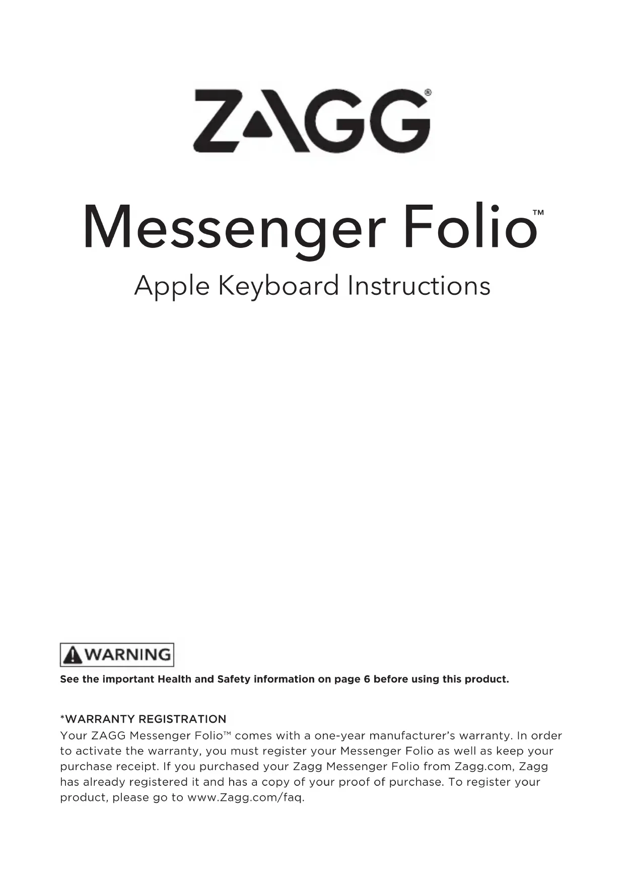 Your ZAGG Messenger Folio™ comes with a one-year manufacturer's warranty. In order to activate the warranty, you must register your Messenger Folio as well as keep your purchase receipt. If you purchased your Zagg Messenger Folio from Zagg.com, Zagg has already registered it and has a copy of your proof of purchase. To register your product, please go to www.Zagg.com/faq.