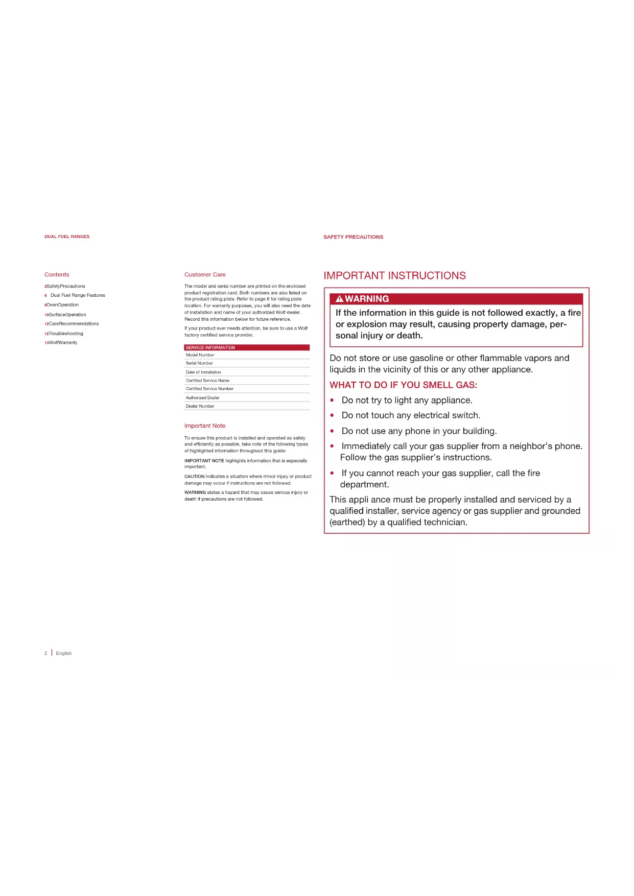 BEDIENUNGS-UND PFLEGEANLEITUNG2 English Contents 2 Safety Precautions6 Dual Fuel Range Features6 Oven Operation10 Surface Operation12 Care Recommendations12 Troubleshooting13 Wolf WarrantyDUAL FUEL RANGES Customer Care The model and serial number are printed on the enclosed product registration card. Both numbers are also listed on the product rating plate. Refer to page 6 for rating plate location. For warranty purposes, you will also need the date of installation and name of your authorized Wolf dealer. Record this information below for future reference. If your product ever needs attention, be sure to use a Wolf factory certied service provider.SERVICE INFORMATIONModel NumberSerial NumberDate of InstallationCertied Service NameCertied Service NumberAuthorized DealerDealer Number Important Note To ensure this product is installed and operated as safely and efciently as possible, take note of the following types of highlighted information throughout this guide:IMPORTANT NOTE highlights information that is especially important. CAUTION indicates a situation where minor injury or product damage may occur if instructions are not followed.WARNING states a hazard that may cause serious injury or death if precautions are not followed. IMPORTANT INSTRUCTIONS WARNING If the information in this guide is not followed exactly, a re or explosion may result, causing property damage, per- sonal injury or death. Do not store or use gasoline or other ammable vapors and liquids in the vicinity of this or any other appliance. WHAT TO DO IF YOU SMELL GAS: