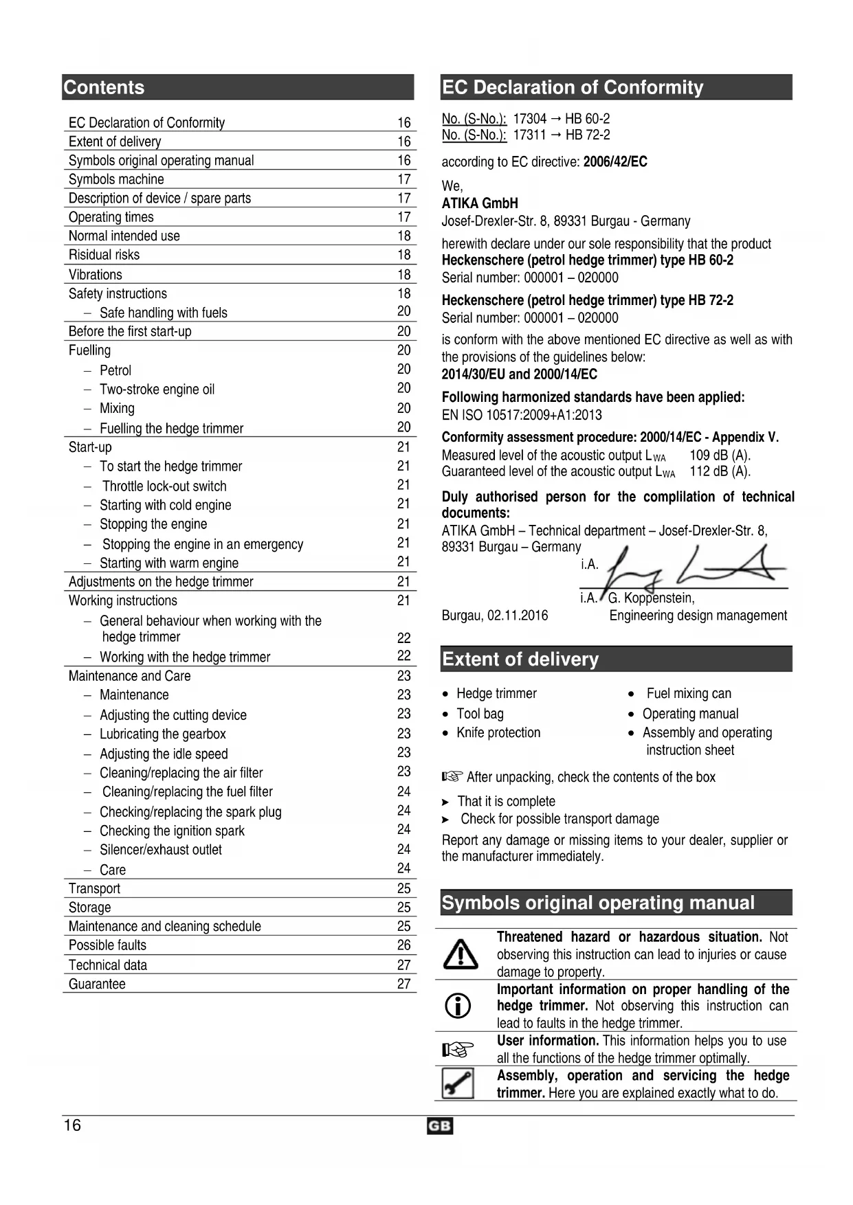 EC Declaration of Conformity No. (S-No.): 17304 HB 60-2 No. (S-No.): 17311 HB 72-2 according to EC directive: 2006/42/EC We, ATIKA GmbH Josef-Drexler-Str. 8, 89331 Burgau - Germany herewith declare under our sole responsibility that the product Heckenschere (petrol hedge trimmer) type HB 60-2 Serial number: 000001 – 020000 Heckenschere (petrol hedge trimmer) type HB 72-2 Serial number: 000001 – 020000 is conform with the above mentioned EC directive as well as with the provisions of the guidelines below: 2014/30/EU and 2000/14/EC Following harmonized standards have been applied: