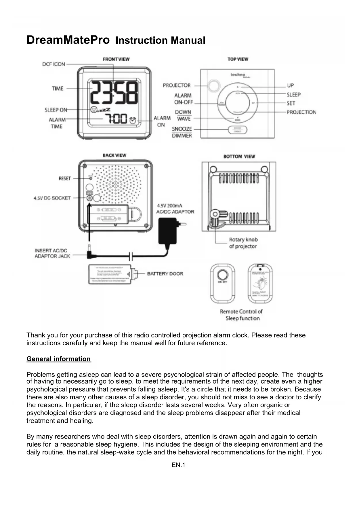 - Breathe 10 times in and out deeply in front of the open window Now use the use the Dream Mate. The principle is very simple. By being forced to focus on the device and to react with a remote control, your thoughts are directed in a certain direction. Other thoughts are stopped and pondering about unresolved conflicts is interrupted. Setting up the device The device projects lines with a random timing on the ceiling or a wall. Place the projector so you can have a good look on the projection in your sleep position. At best you should look over the tip of your nose, so you don’t have to open your eyes too wide. Start of the sleep cycle Before you reduce or turn off the room lights, please take the remote control in your hand and check where the control key is located. Now take your sleep position. If you just press the button once now, the time how long the timer should run appears in the display. The default is 1 minute. If you prefer a longer period of time, press the button repeatedly until the time starts to flash. Then increase the interval in 1-minute increments (for detailed information see “To use the sleep function”). When you are finished, wait until the flashing stops. Now the countdown starts. You can follow the first few seconds on the display. Then projection changes to lines and you need to continue to count the seconds in your head. If you think the set time is up, press the button again. Now you see if you were right. If you should have significantly miscalculated the time, try it again. You will gradually achieve better results. You will notice that your eyelids will become heavy. If you feel the need to sleep now, allow yourself to do so. Do not think about anything else but the numbers. If you find yourself that your mind wanders away, immediately open your eyes again and start a new sleep cycle. Do not let your brain begin to brood over any problems! Concentrate only on your sleep cycle and the numbers. End of the sleep cycle The sleep cycle will stop if have not pressed on the remote button for a long time. The unit will return to normal time display or projection.EN.3 INSTALLATION Plug in the AC/DC adaptor and then plug the DC jack to the lower left back of the unit. Your unit is ready to work for you.