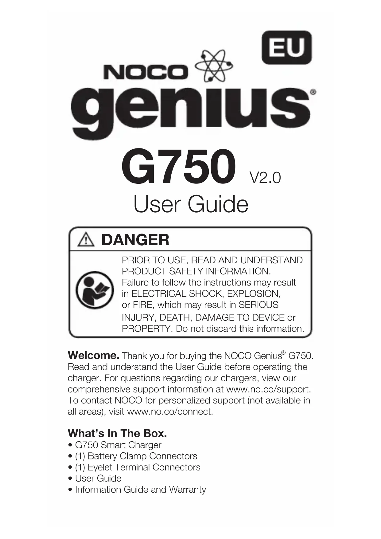 G750. Read and understand the User Guide before operating the charger. For questions regarding our chargers, view our comprehensive support information at www.no.co/support. To contact NOCO for personalized support (not available in all areas), visit www.no.co/connect. What’s In The Box.