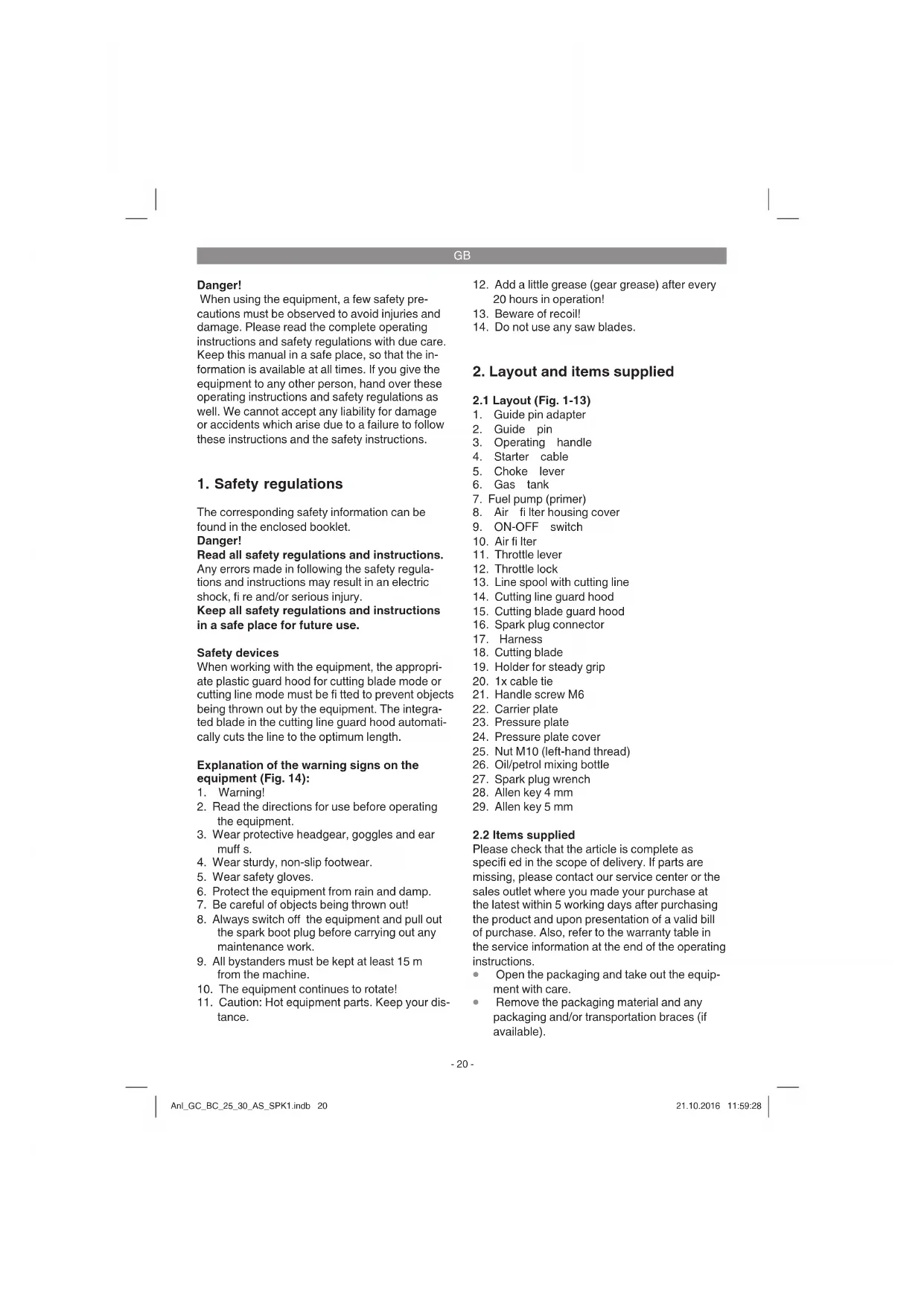 starter cable (Fig. 1/Item 4) until you feel it start to resist. Then tug sharply on the starter cable 2-4 times. The equipment should start. Important: Never allow the starter cable to snap back. This may damage the equipment. Once the engine has started, allow the equip- Anl_GC_BC_25_30_AS_SPK1.indb 23Anl_GC_BC_25_30_AS_SPK1.indb 23 21.10.2016 11:59:2821.10.2016 11:59:28GB