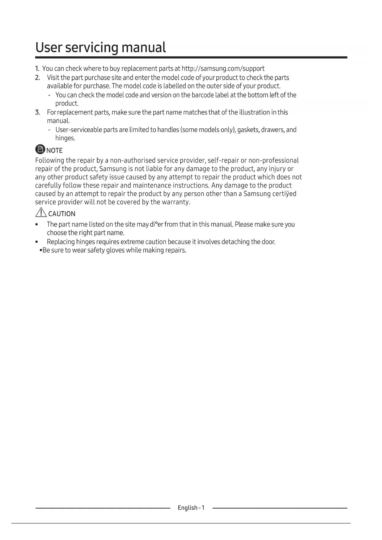 manual. ‐ User-serviceable parts are limited to handles (some models only), gaskets, drawers, and hinges. NOTE Following the repair by a non-authorised service provider, self-repair or non-professional repair of the product, Samsung is not liable for any damage to the product, any injury or any other product safety issue caused by any attempt to repair the product which does not carefully follow these repair and maintenance instructions. Any damage to the product caused by an attempt to repair the product by any person other than a Samsung certiÿed service provider will not be covered by the warranty. CAUTION