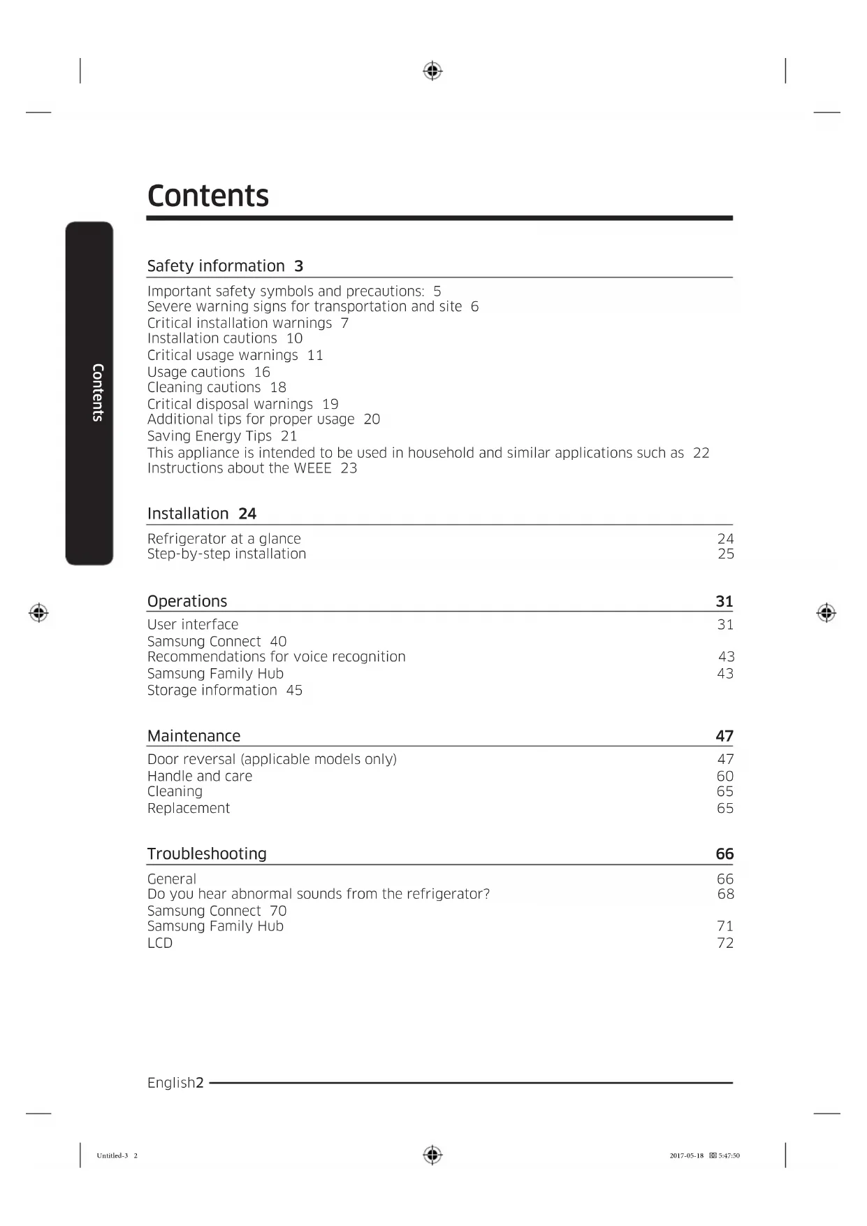 Refrigerator User manual RB38M* SEUK, SEF, SEG, SEI Free Standing Appliance Untitled-3 1 2017-05-18 5:47:50English2 Contents Contents Safety information 3 Important safety symbols and precautions: 5 Severe warning signs for transportation and site 6 Critical installation warnings 7 Installation cautions 10 Critical usage warnings 11 Usage cautions 16 Cleaning cautions 18 Critical disposal warnings 19 Additional tips for proper usage 20 Saving Energy Tips 21 This appliance is intended to be used in household and similar applications such as 22 Instructions about the WEEE 23 Installation 24 Refrigerator at a glance 24 Step-by-step installation 25 Operations 31 User interface 31 Samsung Connect 40 Recommendations for voice recognition 43 Samsung Family Hub 43 Storage information 45 Maintenance 47 Door reversal (applicable models only) 47 Handle and care 60 Cleaning 65 Replacement 65 Troubleshooting 66 General 66 Do you hear abnormal sounds from the refrigerator? 68 Samsung Connect 70 Samsung Family Hub 71 LCD 72 Untitled-3 2 2017-05-18 5:47:50English 3 Safety information