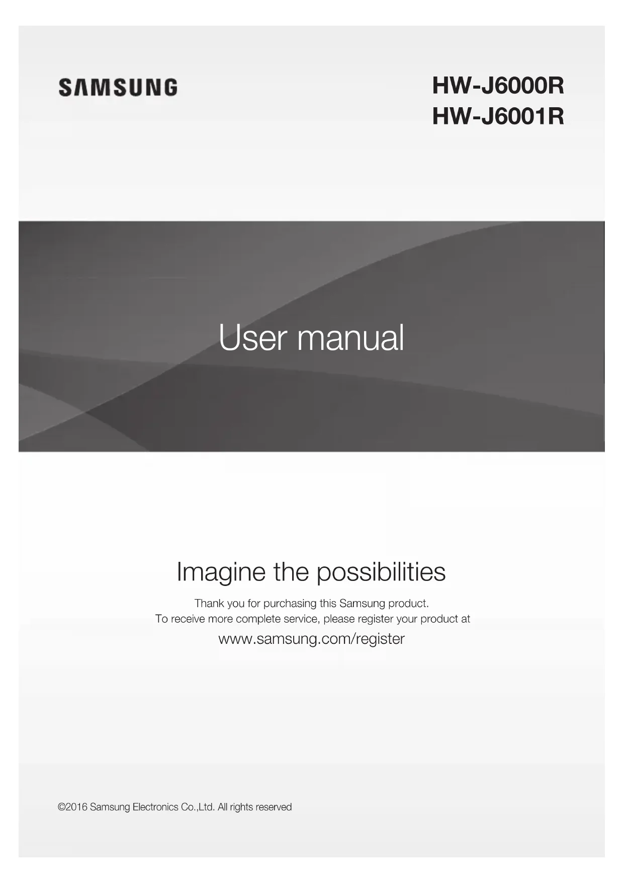 Imagine the possibilities Thank you for purchasing this Samsung product. To receive more complete service, please register your product at www.samsung.com/register User manual HW-J6000R HW-J6001R ©2016 Samsung Electronics Co.,Ltd. All rights reserved2 GETTING STARTED SAFETY INFORMATION SAFETY WARNINGS TO REDUCE THE RISK OF ELECTRIC SHOCK, DO NOT REMOVE THE COVER (OR BACK).NO USER-SERVICEABLE PARTS ARE INSIDE. REFER SERVICING TO QUALIFIED SERVICE PERSONNEL. CAUTION RISK OF ELECTRIC SHOCK. DO NOT OPEN.This symbol indicates that high voltage is present inside. It is dangerous to make any kind of contact with any internal part of this product.This symbol indicates that important literature concerning operation and maintenance has been included with this product.Class II product : This symbol indicates that it does not require a safety connection to electrical earth (ground).AC voltage : This symbol indicates that the rated voltage marked with the symbol is AC voltage.DC voltage : This symbol indicates that the rated voltage marked with the symbol is DC voltage.Caution, Consult instructions for use : This symbol instructs the user to consult the user manual for further safety related information.
