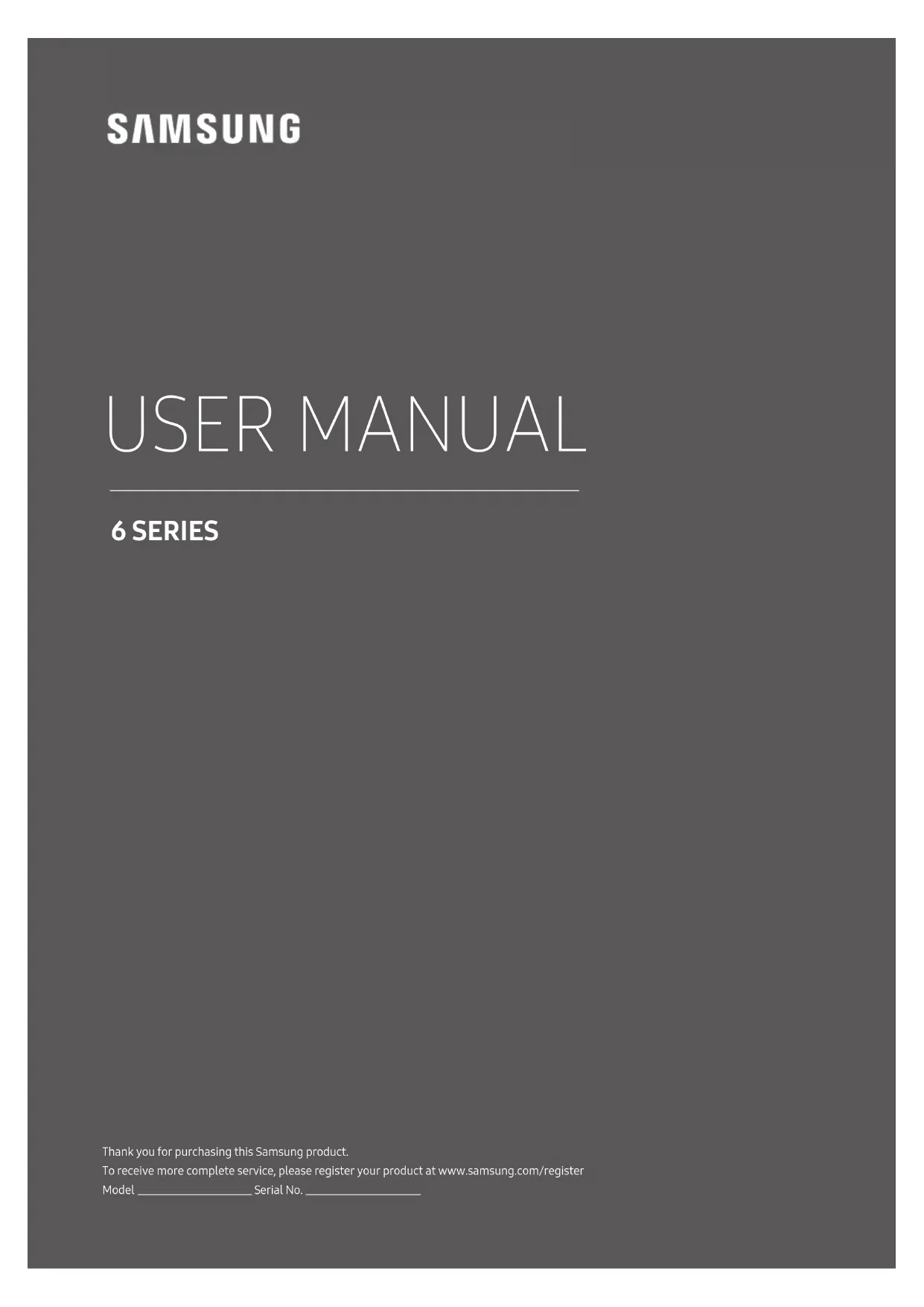 6 SERIES Thank you for purchasing this Samsung product. To receive more complete service, please register your product at www.samsung.com/register Model Serial No. USER MANUALEnglish - 2 Before Reading This User Manual This TV comes with this user manual and an embedded e-Manual. Before reading this user manual, review the following: User Manual Read this provided user manual to see information about product safety, installation, accessories, initial conguration, and product specications. e-Manual For more information about this TV, read the e-Manual embedded in the product.