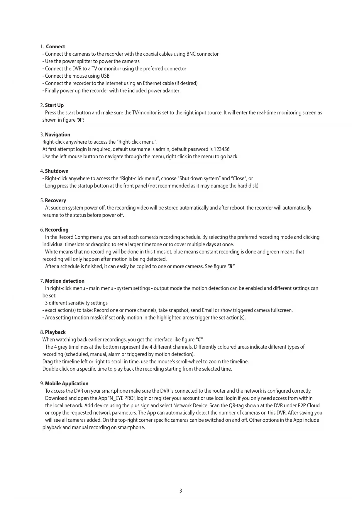 To access the DVR on your smartphone make sure the DVR is connected to the router and the network is congured correctly. Download and open the App “N_EYE PRO”, login or register your account or use local login if you only need access from within the local network. Add device using the plus sign and select Network Device. Scan the QR-tag shown at the DVR under P2P Cloud or copy the requested network parameters. The App can automatically detect the number of cameras on this DVR. After saving you will see all cameras added. On the top-right corner specic cameras can be switched on and o. Other options in the App include playback and manual recording on smartphone. 3Right-Click Menu Brightness Contrast Chroma Saturation AHD TVI AUTO CVI Click and drag in bottom right image to zoom in not applicable with our cameras Select date and camera, search for made recordings in bottom timeline Play / Pause Play / Pause current video Stop Stop the video, all screens close Fast Forward / Rewind Video Fast Forward / Rewind Slow / Fast Play the video at the speed of 1X/2X/4X/8X/16X Screen splitting mode Watch 4 cameras simultaneously Backup Backup recordings on USB hard disk Capture Save still frame of the selected channel Full Screen Single-click to enter full screen Electronic zoom Use the thumbnail on the bottom right corner to select an area to zoom in to Exit Playback Return to preview page Image Color Video Mode Settings Electronic Zoom PTZ control Video Query Main Menu Backup Record Conguration System Setting Basic / Manual / Event Schedule Output Mode Channel default = ch. 1, select which channel to set. Stream type video = video only, composite = video and audio Video quality set quality (higher quality = larger les) Resolution automatically dened by the camera Bit rate limit choose preset value or set manually Frame rate choose any value, default is "full frame rate"; Channel Select the camera for which to set the recording schedule Select the desired type of recording (No, Common or Motion) Click and drag to set the schedule for the entire week Copy the selected schedule to other cameras if needed. Menu Output Camera Name Camera Mosaic Video Loss Motion detection Color Settings Menu Transparency Screen Saver Time Resolution Output Cong