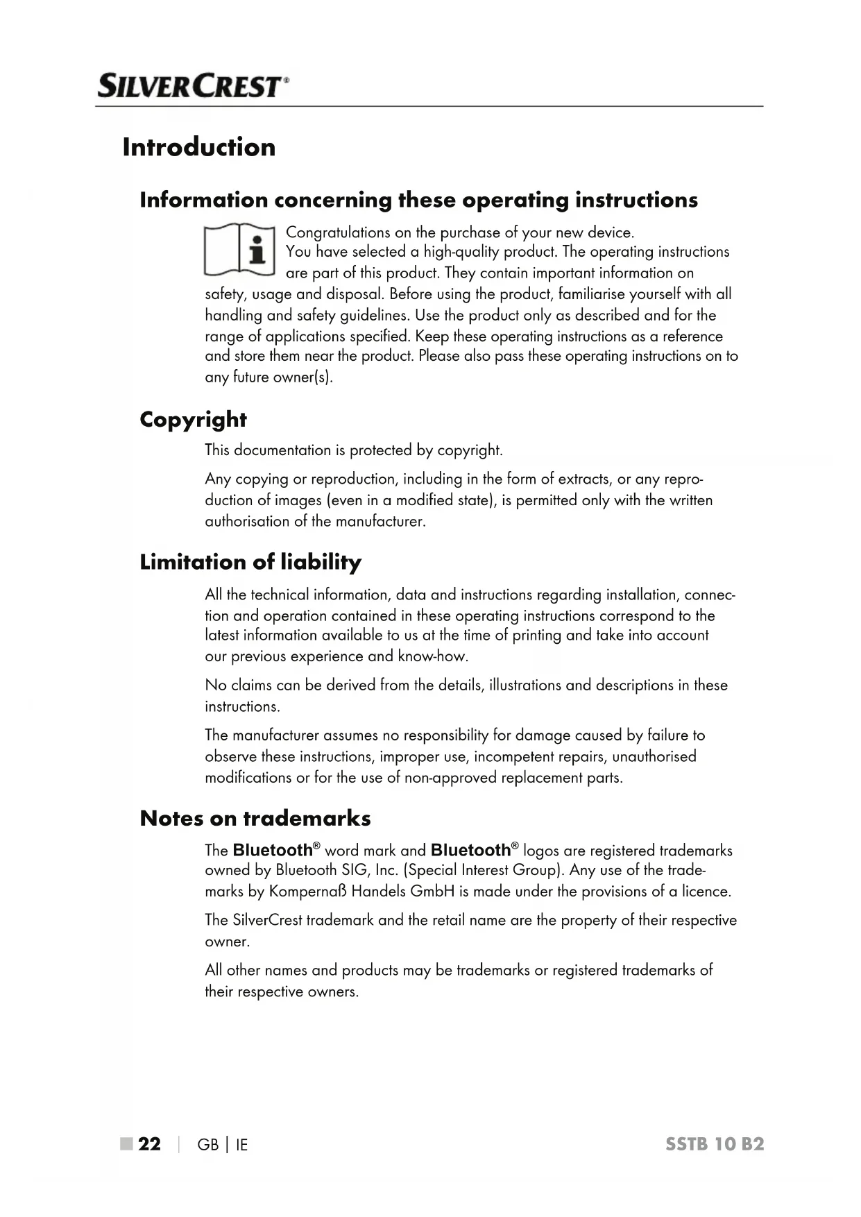 SSTB 10 B2 Introduction Information concerning these operating instructions Congratulations on the purchase of your new device. You have selected a high-quality product. The operating instructions are part of this product. They contain important information on safety, usage and disposal. Before using the product, familiarise yourself with all handling and safety guidelines. Use the product only as described and for the range of applications specified. Keep these operating instructions as a reference and store them near the product. Please also pass these operating instructions on to any future owner(s). Copyright This documentation is protected by copyright. Any copying or reproduction, including in the form of extracts, or any repro- duction of images (even in a modified state), is permitted only with the written authorisation of the manufacturer. Limitation of liability All the technical information, data and instructions regarding installation, connec- tion and operation contained in these operating instructions correspond to the latest information available to us at the time of printing and take into account our previous experience and know-how. No claims can be derived from the details, illustrations and descriptions in these instructions. The manufacturer assumes no responsibility for damage caused by failure to observe these instructions, improper use, incompetent repairs, unauthorised modifications or for the use of non-approved replacement parts. Notes on trademarks The Bluetooth
