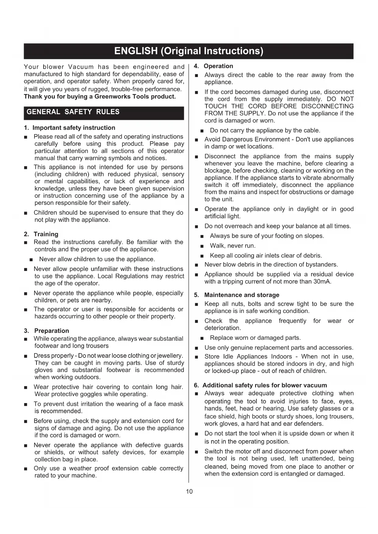Download the instructions for your Blower in PDF format for free! Find your manual 24077 - GREENWORKS and take your electronic device back in hand. On this page are published all the documents necessary for the use of your device. 24077 by GREENWORKS.