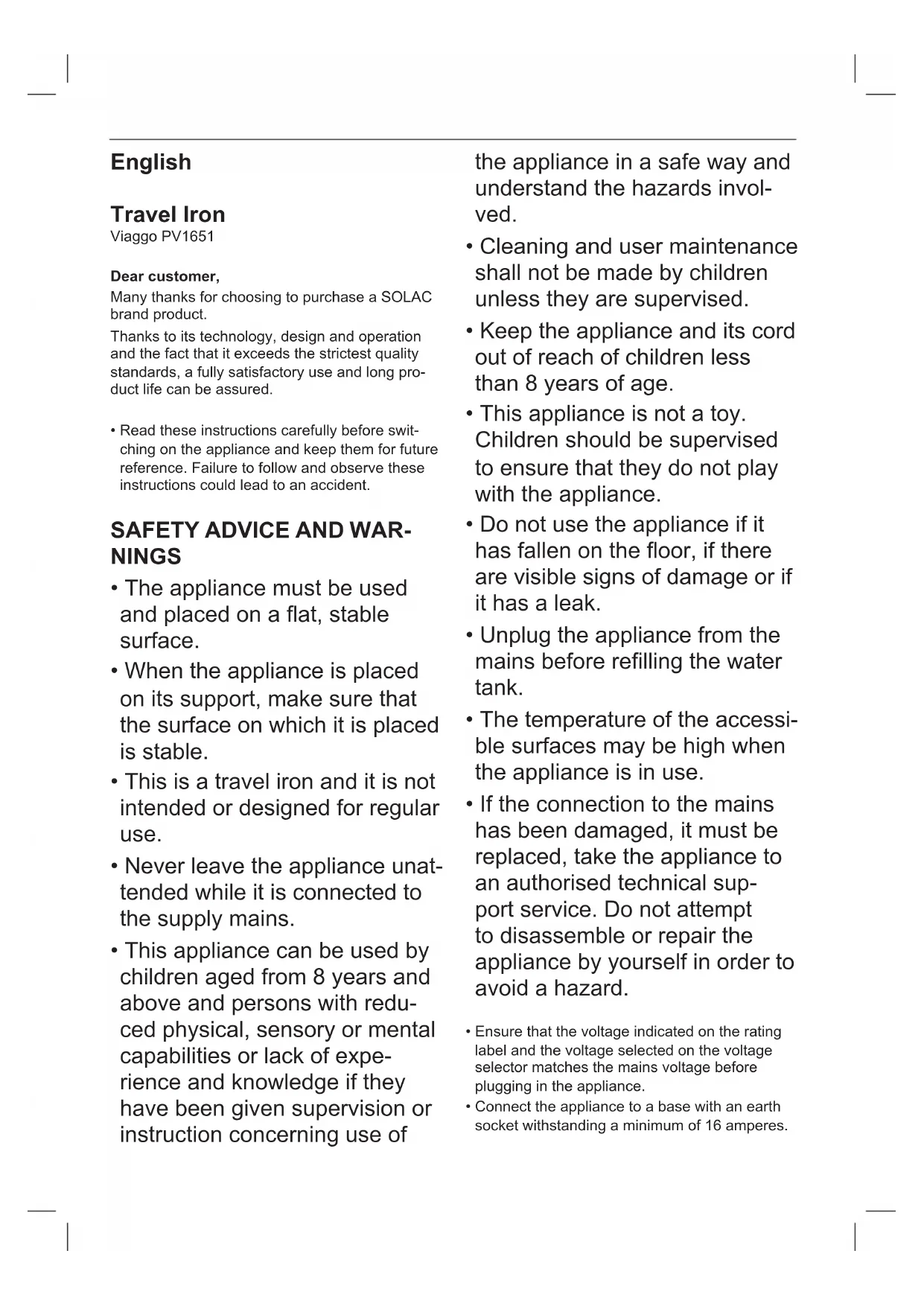 - The product does not contain concentrations of substances that could be considered harmful to the environment. This symbol means that in case you wish to dispose of the product once its working life has ended, take it to an authorised waste agent for the selective collection of Waste from Electric and Electronic Equipment (WEEE). This symbol means that surface could to get hot during the use This appliance complies with Directive 2014/35/ EU on Low Voltage, Directive 2014/30/EU on Electromagnetic Compatibility, Directive 2011/65/ EU on the restrictions of the use of certain hazardous substances in electrical and electro- nic equipment and Directive 2009/125/EC on the ecodesign requirements for energy-related products.Français Fer à repasser de voyage Viaggo PV1651 Cher Client, Nous vous remercions d’avoir acheté un produit SOLAC. Sa technologie, son design et sa fonctionnalité, outre sa parfaite conformité aux normes de qua- lité les plus strictes, vous permettront d’en tirer une longue et durable satisfaction.