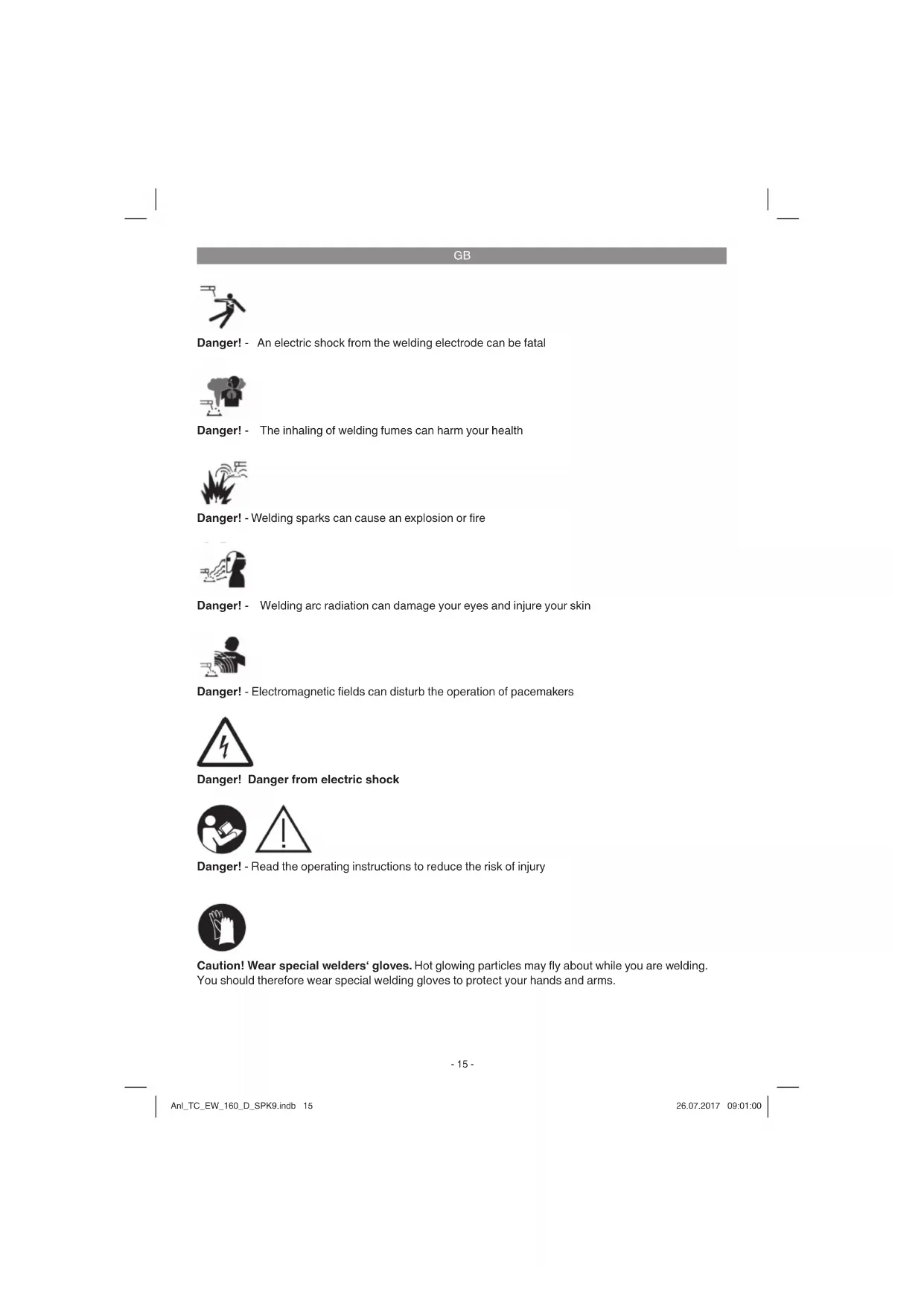 Danger! - An electric shock from the welding electrode can be fatal Danger! - The inhaling of welding fumes can harm your health Danger! - Welding arc radiation can damage your eyes and injure your skin Danger! - Welding sparks can cause an explosion or fi re Danger! - Electromagnetic fi elds can disturb the operation of pacemakers Danger! Danger from electric shock Danger! - Read the operating instructions to reduce the risk of injury Caution! Wear special welders‘ gloves. Hot glowing particles may fl y about while you are welding. You should therefore wear special welding gloves to protect your hands and arms. Anl_TC_EW_160_D_SPK9.indb 15Anl_TC_EW_160_D_SPK9.indb 15 26.07.2017 09:01:0026.07.2017 09:01:00GB