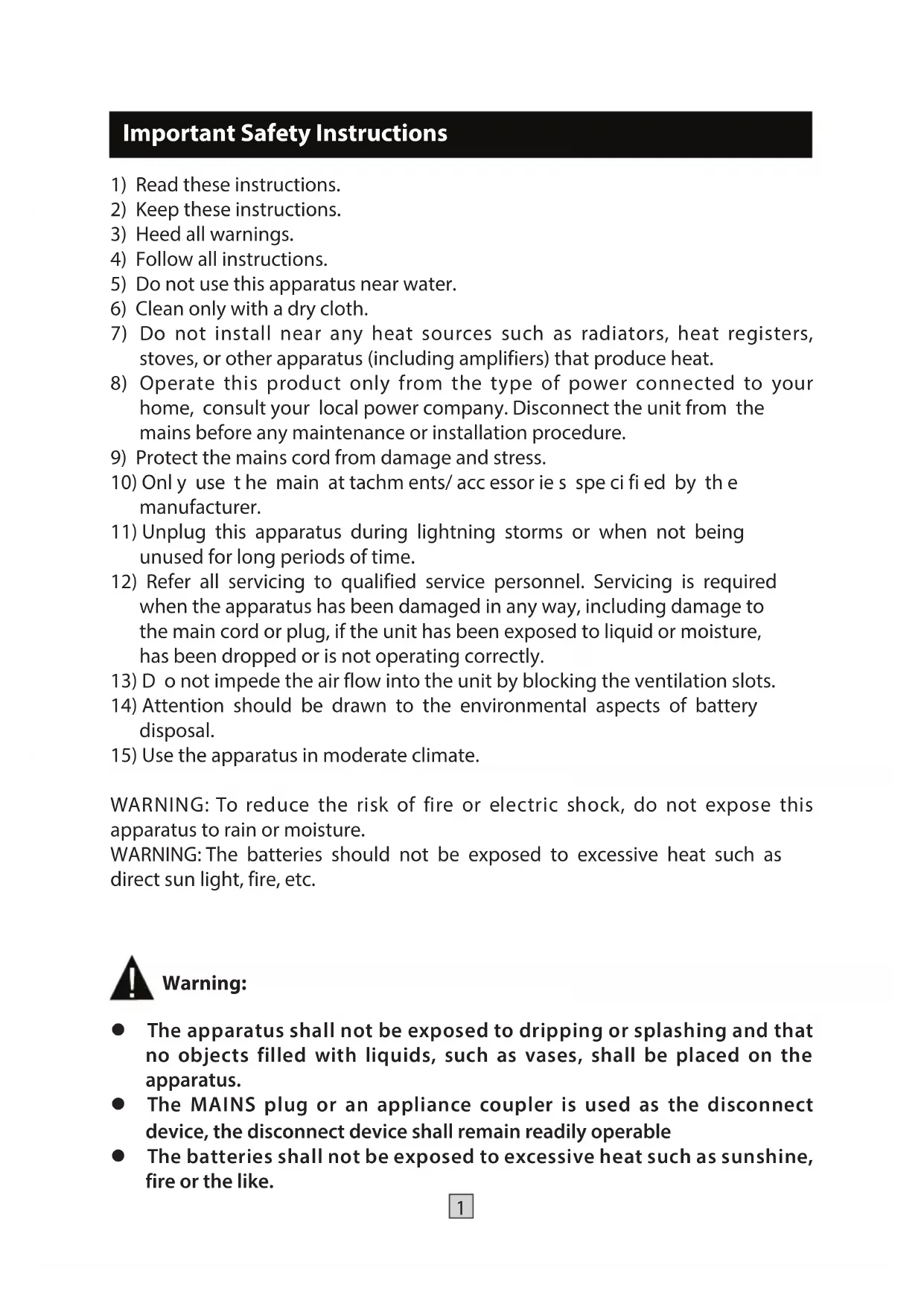 12) Refer all servicing to qualified service personnel. Servicing is required when the apparatus has been damaged in any way, including damage to the main cord or plug, if the unit has been exposed to liquid or moisture, has been dropped or is not operating correctly.