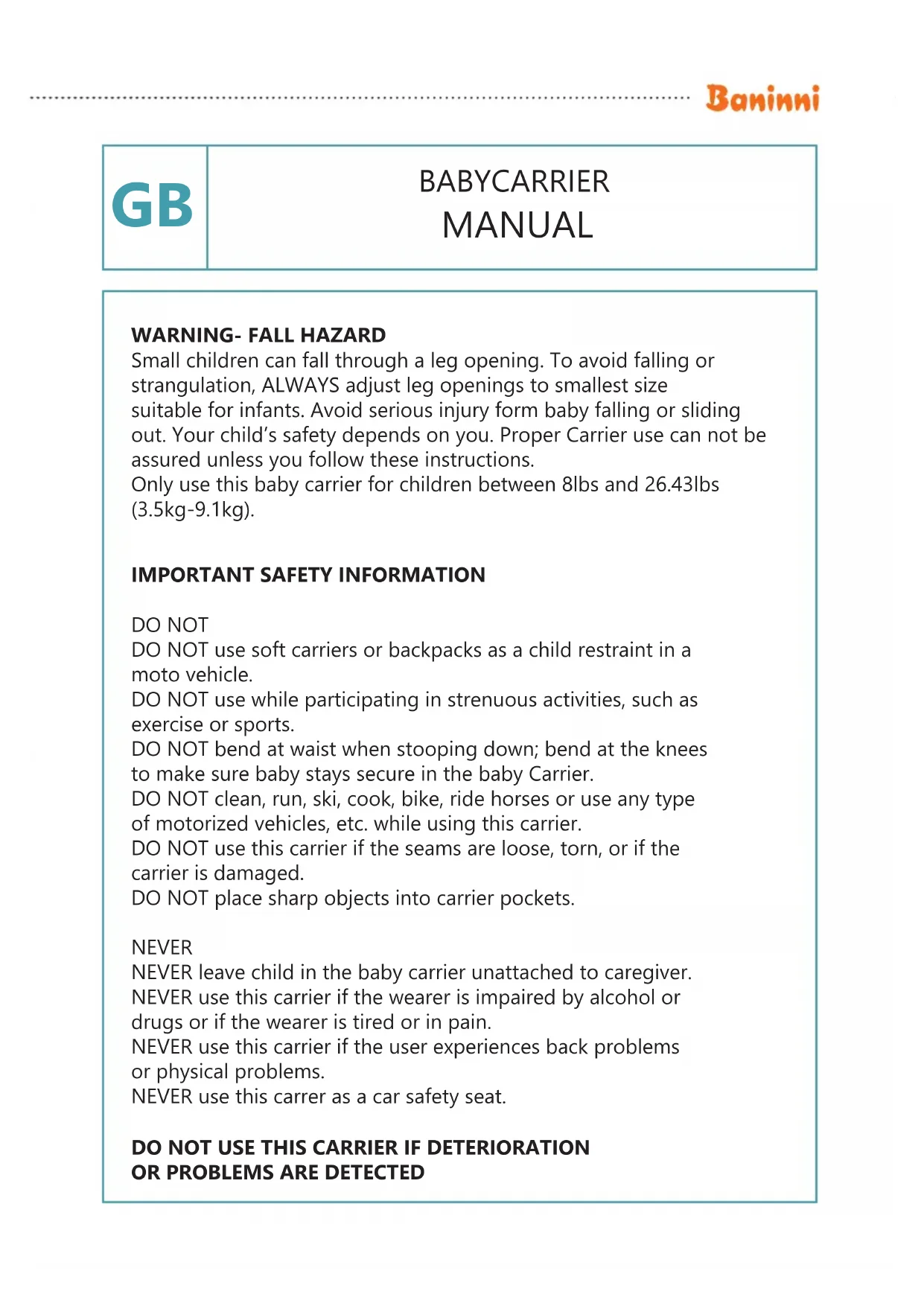 Only use this baby carrier for children between 8lbs and 26.43lbs (3.5kg-9.1kg).