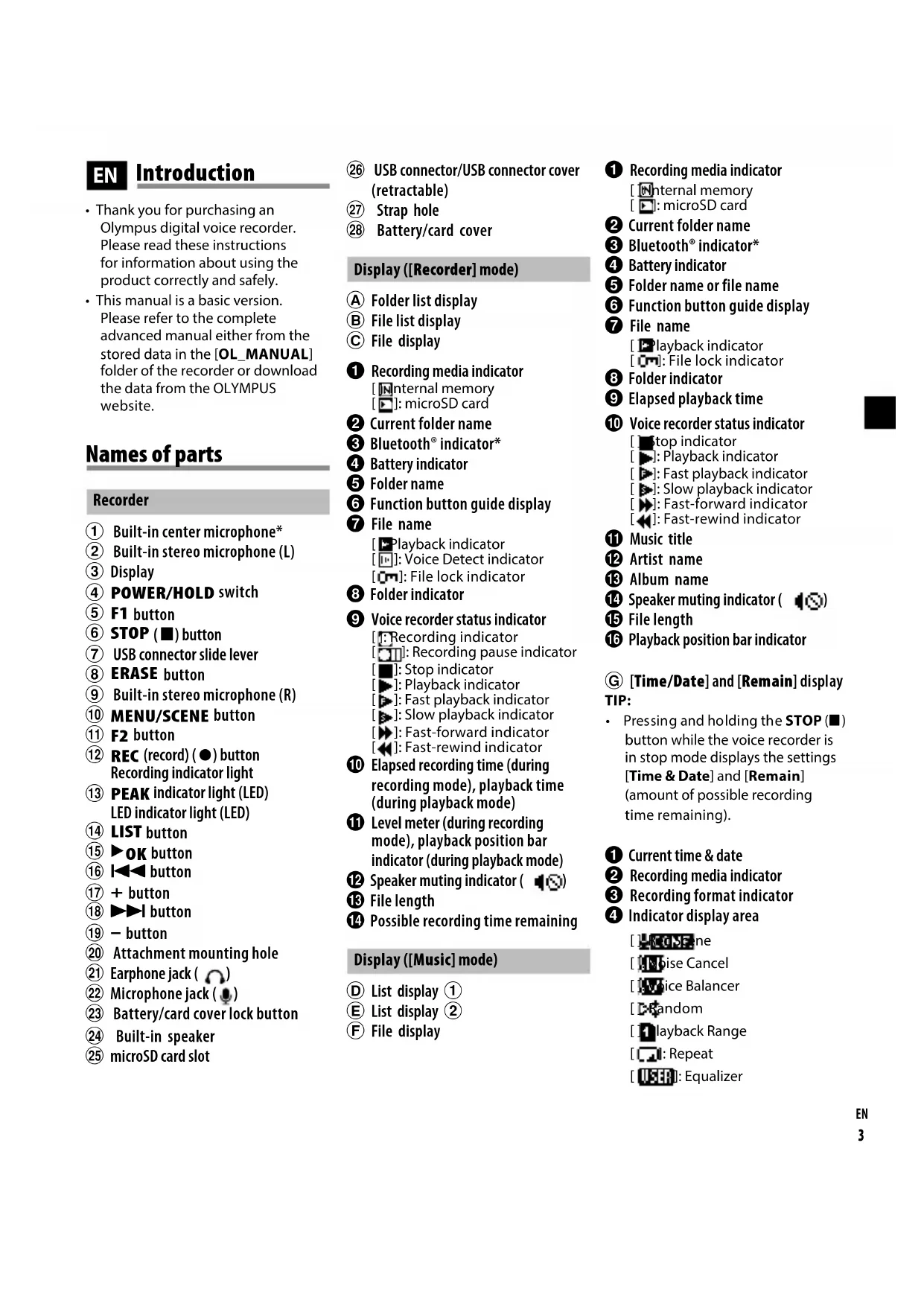 - This manual is a basic version. Please refer to the complete advanced manual either from the stored data in the [OL_MANUAL] folder of the recorder or download the data from the OLYMPUS website. Introduction
