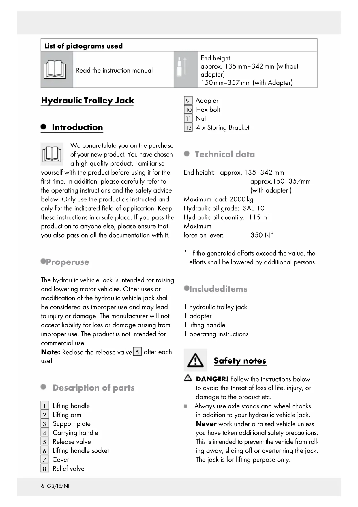 - If the generated efforts exceed the value, the efforts shall be lowered by additional persons. Included items 1 hydraulic trolley jack 1 adapter 1 lifting handle 1 operating instructions Safety notes DANGER! Follow the instructions below to avoid the threat of loss of life, injury, or damage to the product etc. Always use axle stands and wheel chocks in addition to your hydraulic vehicle jack. Never work under a raised vehicle unless you have taken additional safety precautions. This is intended to prevent the vehicle from roll- ing away, sliding off or overturning the jack. The jack is for lifting purpose only.7 GB/IE/NI Use the product on a solid, level surface only. Using the product on an unstable or uneven surface – such as a gravel surface – may lead to the load slipping.