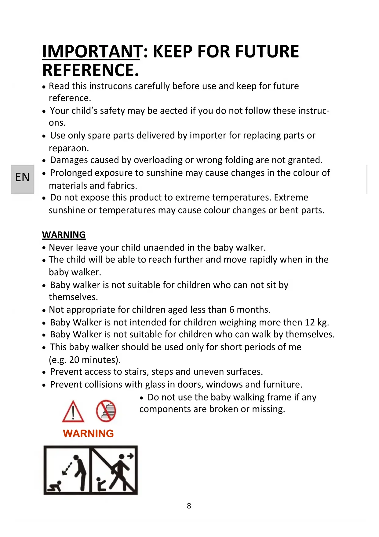 Not appropriate for children aged less than 6 months. Baby Walker is not intended for children weighing more then 12 kg. Baby Walker is not suitable for children who can walk by themselves. This baby walker should be used only for short periods of time (e.g. 20 minutes). Prevent access to stairs, steps and uneven surfaces. Prevent collisions with glass in doors, windows and furniture. Do not use the baby walking frame if any components are broken or missing.
