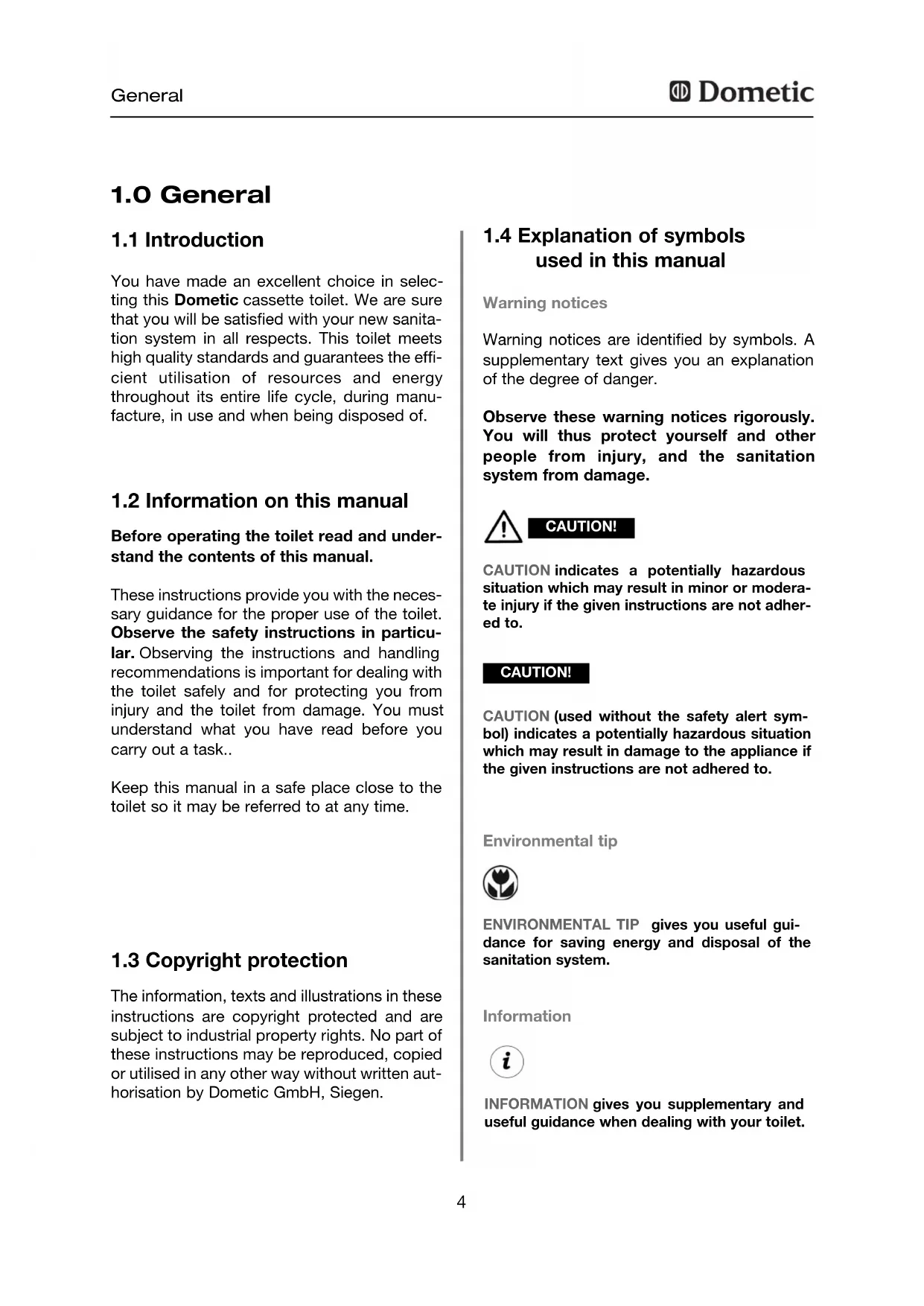used in this manual Warning notices are identified by symbols. A supplementary text gives you an explanation of the degree of danger. Observe these warning notices rigorously. You will thus protect yourself and other people from injury, and the sanitation system from damage. Warning notices CAUTION indicates a potentially hazardous situation which may result in minor or modera- te injury if the given instructions are not adher- ed to. CAUTION! Environmental tip ENVIRONMENTAL TIP gives you useful gui- dance for saving energy and disposal of the sanitation system. CAUTION (used without the safety alert sym- bol) indicates a potentially hazardous situation which may result in damage to the appliance if the given instructions are not adhered to. CAUTION! Information INFORMATION gives you supplementary and useful guidance when dealing with your toilet.5 General Warranty arrangements are in accordance with EC Directive 44/1999/CE and the normal conditions applicable for the country concer- ned. For warranty or other maintenance, plea- se contact our customer services department. Any malfunction due to improper use is not covered by the warranty. The warranty does not cover any modifications to the appliance or the use of non-original Dometic parts. The warranty does not apply if the installation and operating instructions are not adhered to and no liability shall be entertained.