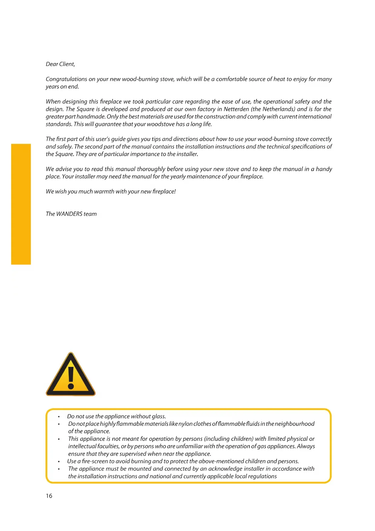 Tabel geeft aan welke isolatiedikte gekozen moet worden bij welke muurdikte, ter bescherming van inbouwwanden16 Dear Client, Congratulations on your new wood-burning stove, which will be a comfortable source of heat to enjoy for many years on end. When designing this replace we took particular care regarding the ease of use, the operational safety and the design. The Square is developed and produced at our own factory in Netterden (the Netherlands) and is for the greater part handmade. Only the best materials are used for the construction and comply with current international standards. This will guarantee that your woodstove has a long life. The rst part of this user’s guide gives you tips and directions about how to use your wood-burning stove correctly and safely. The second part of the manual contains the installation instructions and the technical specications of the Square. They are of particular importance to the installer. We advise you to read this manual thoroughly before using your new stove and to keep the manual in a handy place. Your installer may need the manual for the yearly maintenance of your replace. We wish you much warmth with your new replace! The WANDERS team