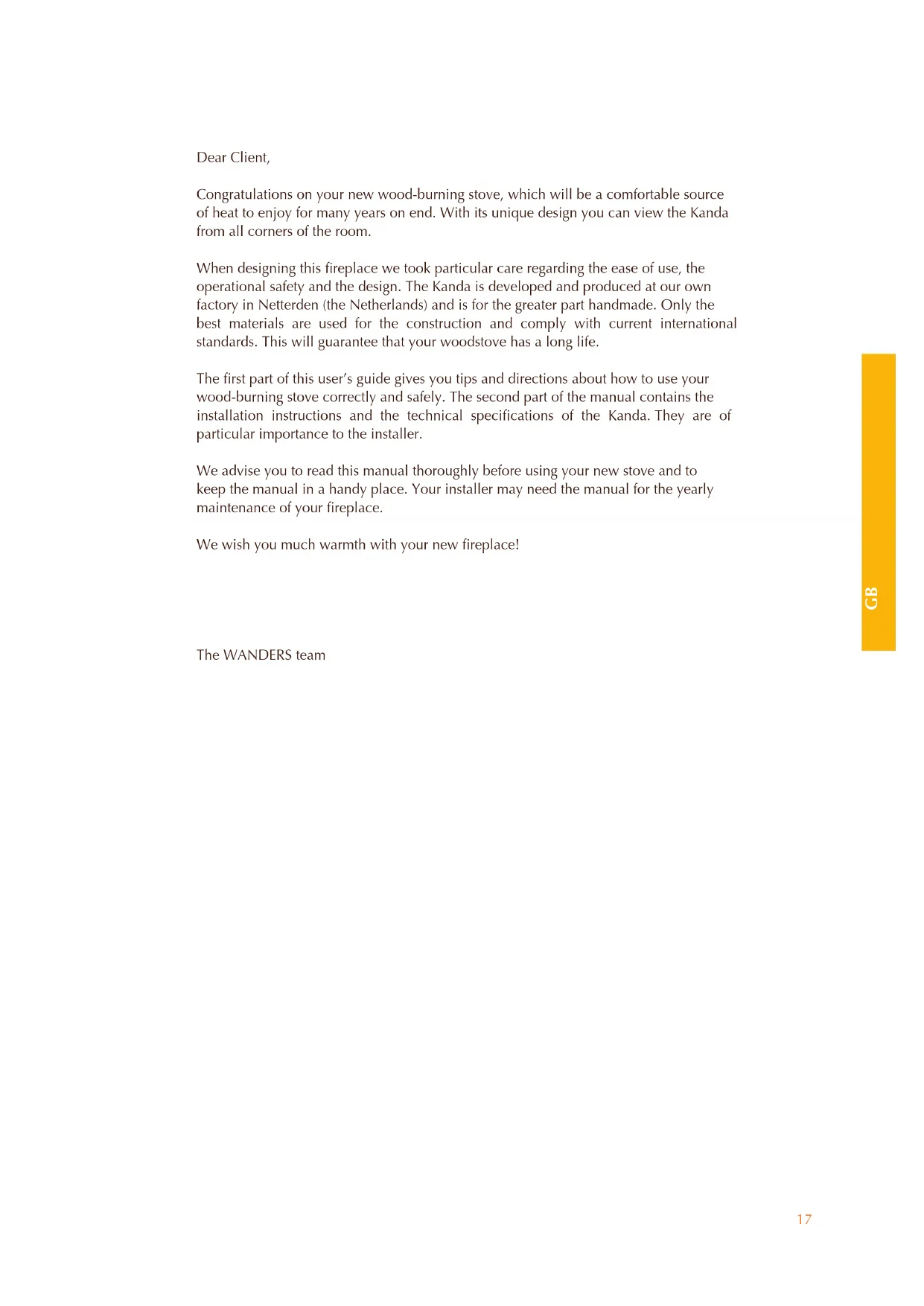 The first part of this user's guide gives you tips and directions about how to use your wood-burning stove correctly and safely. The second part of the manual contains the installation instructions and the technical specifications of the Kanda. They are of particular importance to the installer.