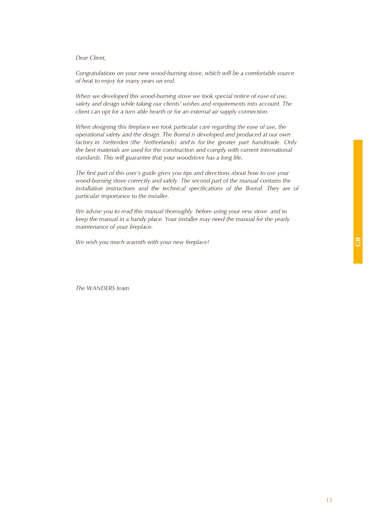 Dear Client, Congratulations on your new wood-burning stove, which will be a comfortable source of heat to enjoy for many years on end. When we developed this wood-burning stove we took special notice of ease of use, safety and design while taking our clients’ wishes and requirements into account. The client can opt for a turn able hearth or for an external air supply connection. When designing this fireplace we took particular care regarding the ease of use, the operational safety and the design. The Boreal is developed and produced at our own factory in Netterden (the Netherlands) and is for the greater part handmade. Only the best materials are used for the construction and comply with current international standards. This will guarantee that your woodstove has a long life. The first part of this user’s guide gives you tips and directions about how to use your wood-burning stove correctly and safely. The second part of the manual contains the installation instructions and the technical specifications of the Boreal. They are of particular importance to the installer. We advise you to read this manual thoroughly before using your new stove and to keep the manual in a handy place. Your installer may need the manual for the yearly maintenance of your fireplace. We wish you much warmth with your new fireplace! The WANDERS team16 Table of Contents Your Boreal wood-burning stove at a single glance 17 Installation 17 Lighting the stove 17 Lighting the stove for the first time 18 Fuel: wood 19 The best way to burn your stove 19 Chimney and flue 20 Maintenance 20 Safety 20 Guarantee 21 Installation instructions Boreal 22 Technical drawings 5517