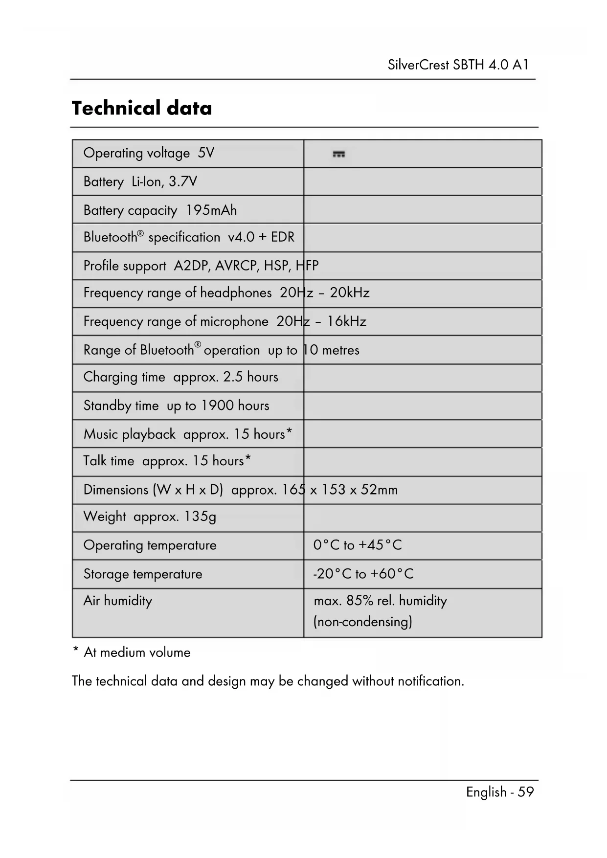 - At medium volume The technical data and design may be changed without notification.SilverCrest SBTH 4.0 A1