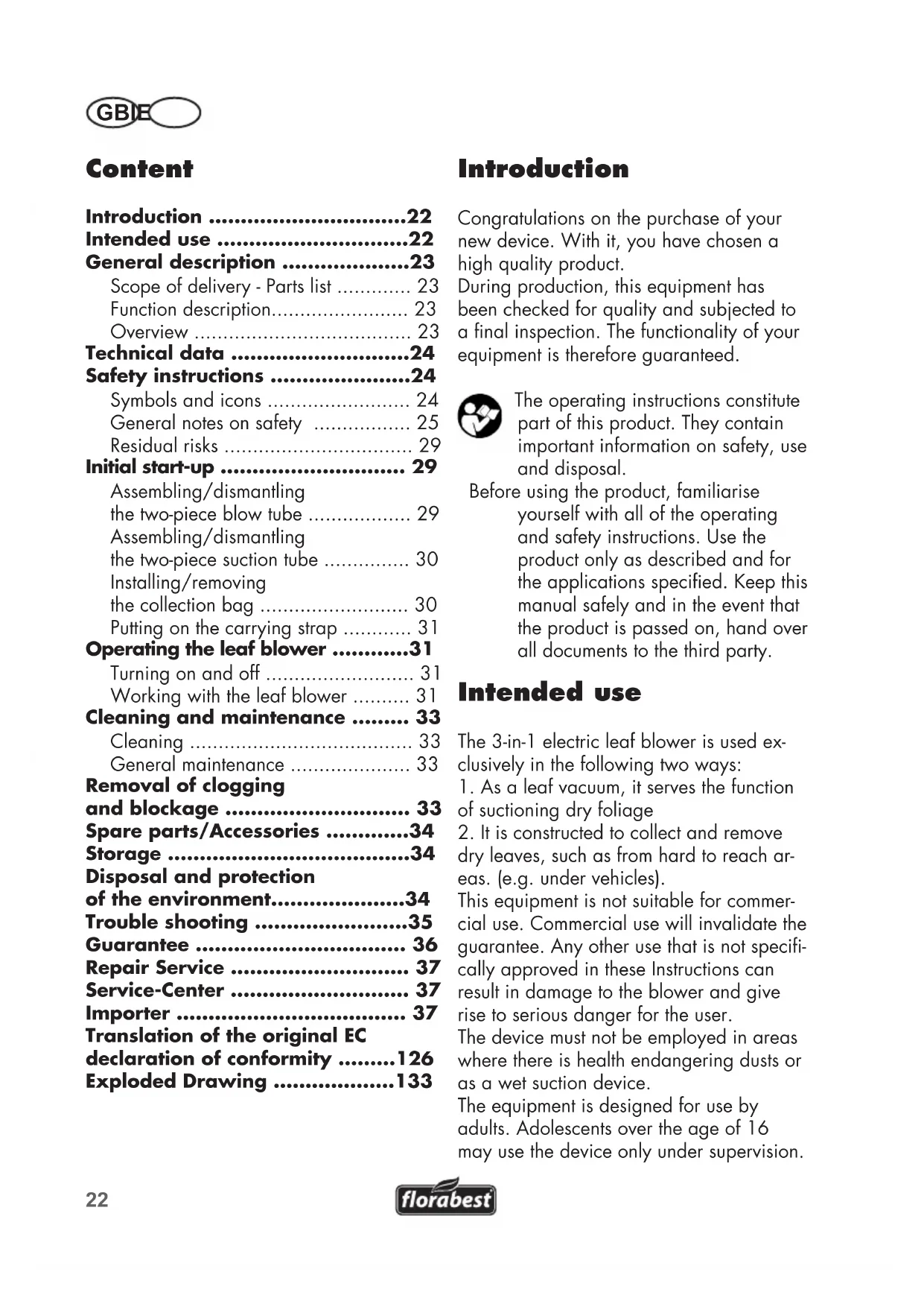 dry leaves, such as from hard to reach ar- eas. (e.g. under vehicles). This equipment is not suitable for commer- cial use. Commercial use will invalidate the guarantee. Any other use that is not speci- cally approved in these Instructions can result in damage to the blower and give rise to serious danger for the user. The device must not be employed in areas where there is health endangering dusts or as a wet suction device. The equipment is designed for use by adults. Adolescents over the age of 16 may use the device only under supervision. Translation of the original EC declaration of conformity .........126 Exploded Drawing ...................13323 IEGB The use of the device in the rain or in a humid environment is forbidden. The user or operator is responsible for ac- cidents causing injury to other people or damage to property. The manufacturer cannot be held liable for damage when the blower is not used in conformity with its intended purpose or due to incorrect operation. A leaf vacuum is not intended for wet conditions! Avoid wet materi- als such as leaves and dirt, twigs, branches, pine needles, grass, earth, sand, mulch, cuttings, etc. Do not use on wet lawns, grass areas or elds. Misuse may lead to congestion in the shredding unit and lead to reduced functionality. The machine may need to be completely dismantled and cleaned. This work should be carried out by a qualied service technician and is not covered by guarantee. General description The illustration of the principal functioning parts can be found on the front and back foldout pages. Scope of delivery - Parts list Unpack the device and check for complete- ness. Dispose of the packaging material properly. - 3-in-1 Electric Leaf Blower - Blower pipe (2-piece) - Suction pipe (2-piece) - Carrying strap - Collection bag - Instructions for use Function description The 3-in-1 electric leaf blower has a blow- ing/vacuuming unit for the blowing and suction functions. In blowing mode, you can quickly blow together fallen leaves or blown them out of places that are difcult to reach. In suction mode, the leaves are shredded to save space, and blown out of the ejector outlet into the collection bag. Refer to the following descriptions for a functional description of the controls. Overview K L M N O P Q R S T U V W X Y Z A B C D E F G H I J 1 engine housing 2 volume control 3 handle 4 on/off switch 5 cable strain relief 6 power plug 7 protective cover for suction intake 8 locking knob for blowing aperture (not visible) 9 blower pipe (2-piece) 10 auxiliary handle 11a/b attachment eye for carrying strap 12 carrying strap 13 screw with star grip, suction pipe 14 collection bag 15 fastening eye for catcher 16 suction pipe (2-piece) 17 screw with star grip, additional handle (not visible) K L M N O P Q R S T U V W X Y Z