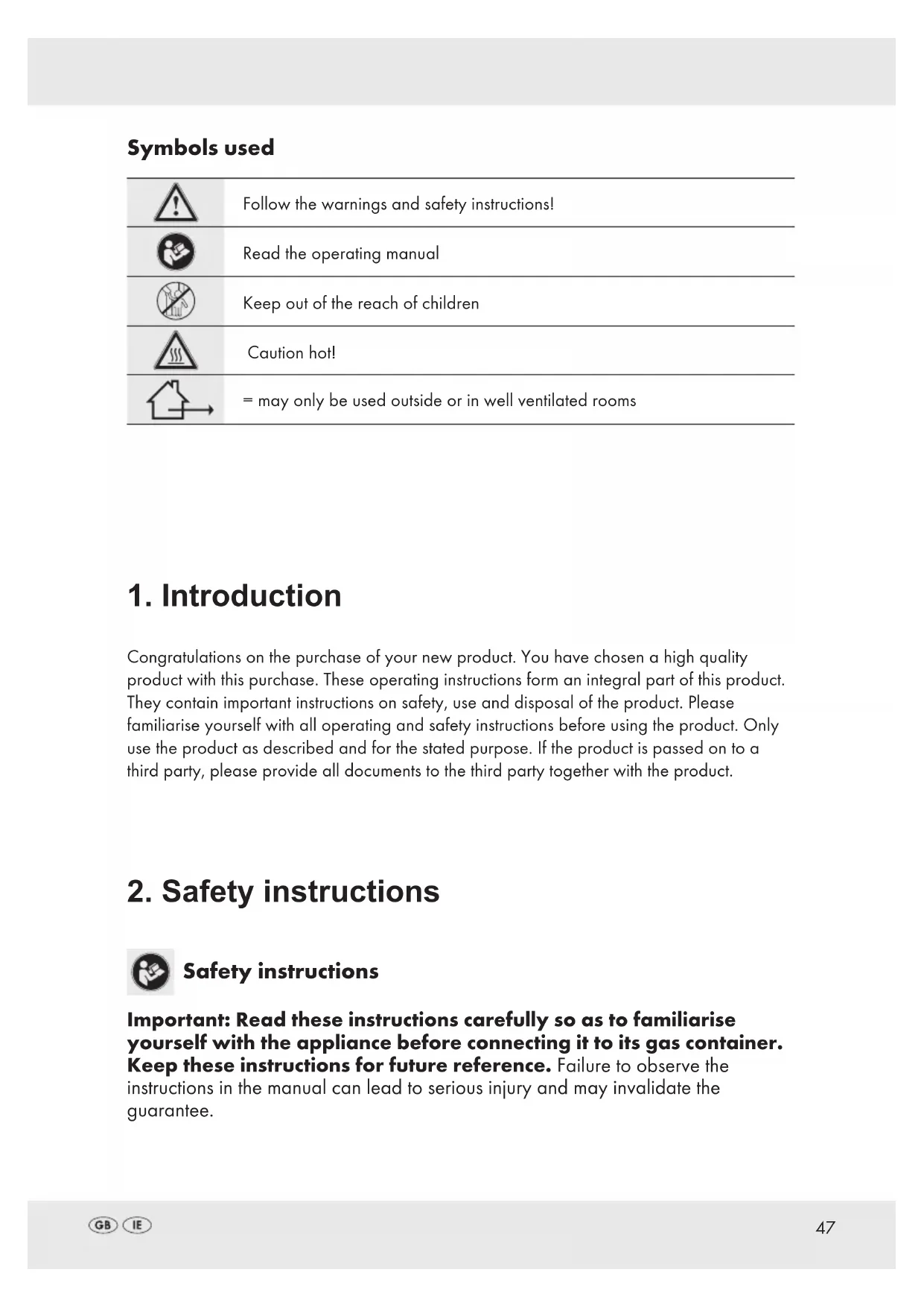Symbols used Follow the warnings and safety instructions! Read the operating manual Keep out of the reach of children Caution hot! = may only be used outside or in well ventilated rooms48 - The appliance and the accessories shall not be modified. Repairs may only be carried out by an authorised workshop or by a qualified person. This appliance shall only be used in well-ventilated areas. In doing so, the national regulations are applicable