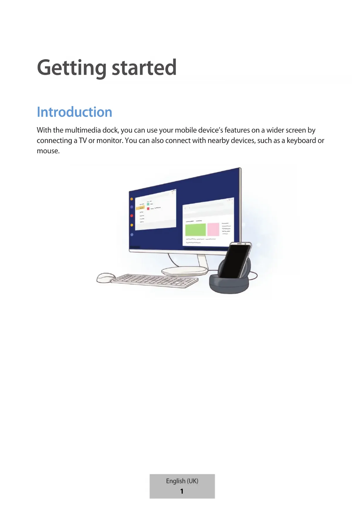Français (Canada) Português (Brasil) 한국어3 Getting started Introduction With the multimedia dock, you can use your mobile device’s features on a wider screen by connecting a TV or monitor. You can also connect with nearby devices, such as a keyboard or mouse. English (UK) 1Getting started